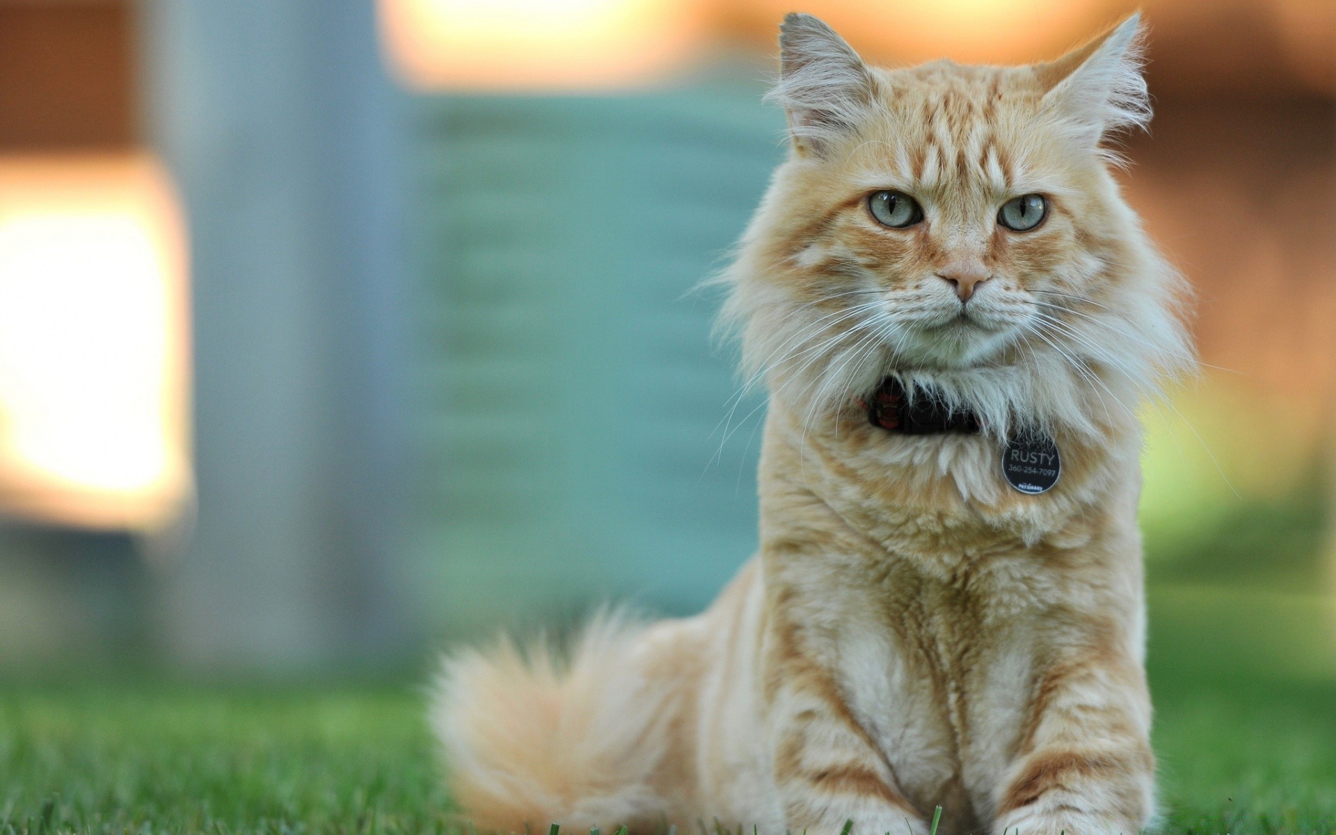 A cat with a stern look is sitting on the lawn