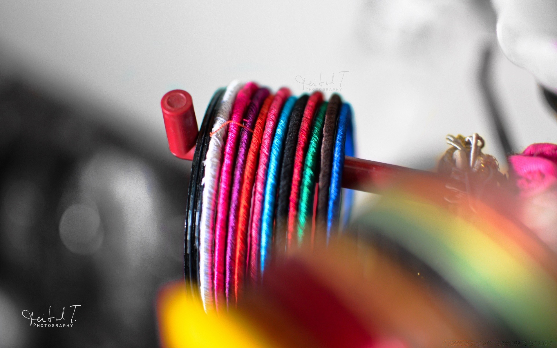 Multicolored Christmas threads on a gray background