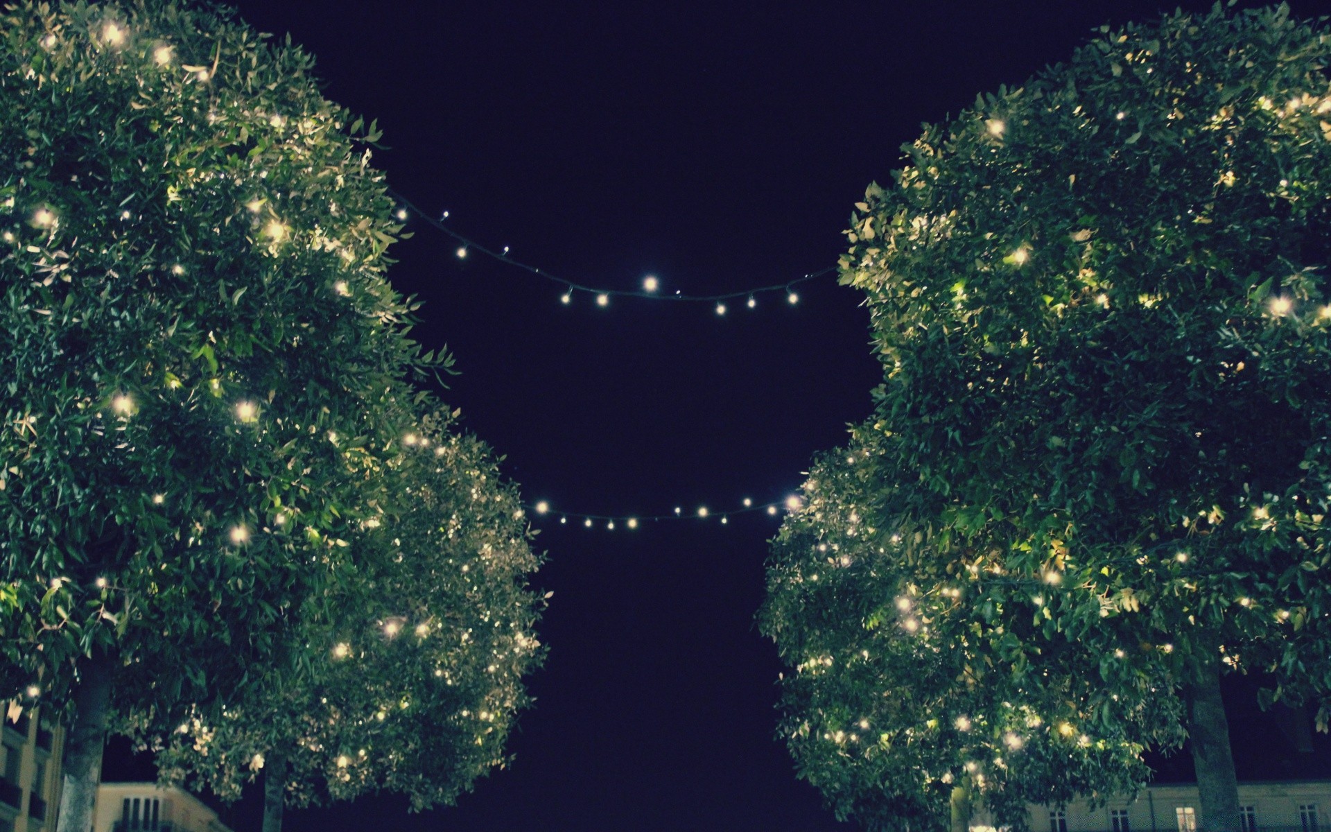 Trees decorated with christmas garlands in the darkTrees decorated with Christmas garlands in the dark