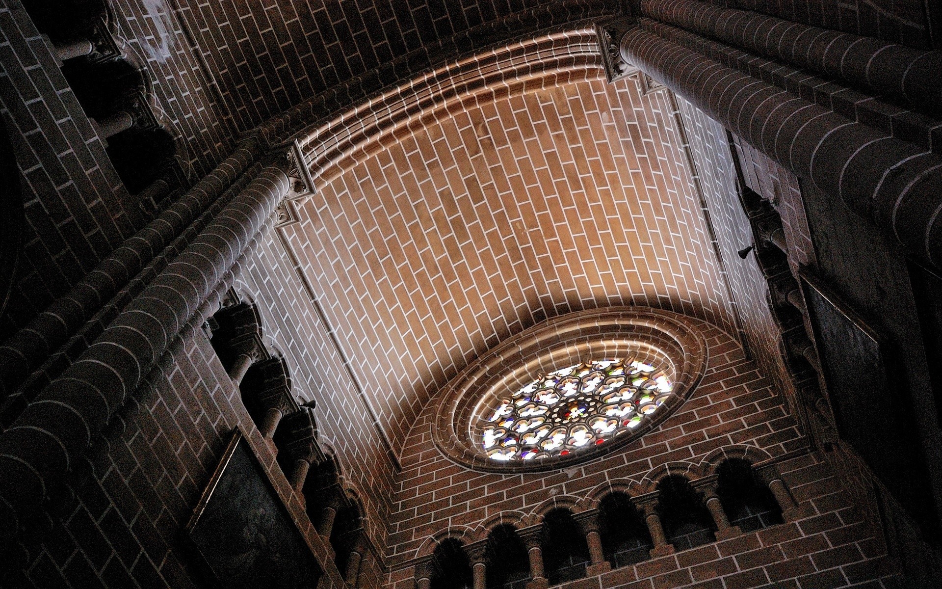 A wide staircase inside the building with beautiful architecture in warm yellow tones
