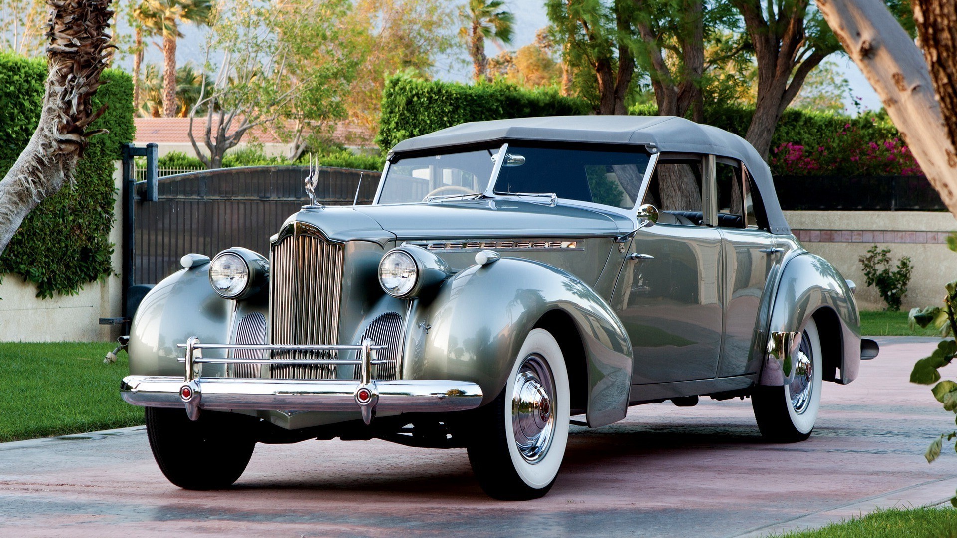 A passenger car of the early 20th century green with a convertible top and two passengers