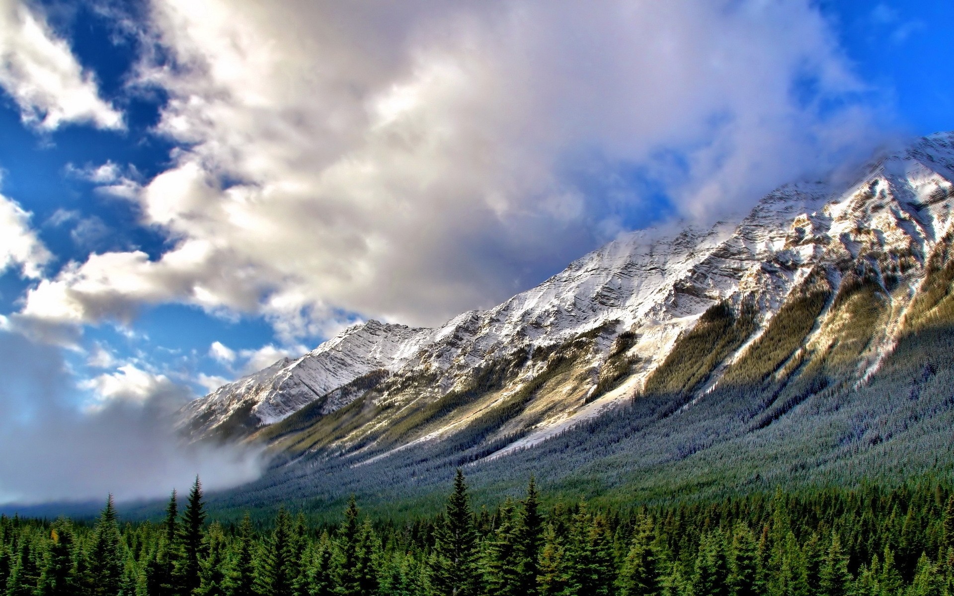 Landscape. Lake in the mountains, clouds in the sky and snowy peaks