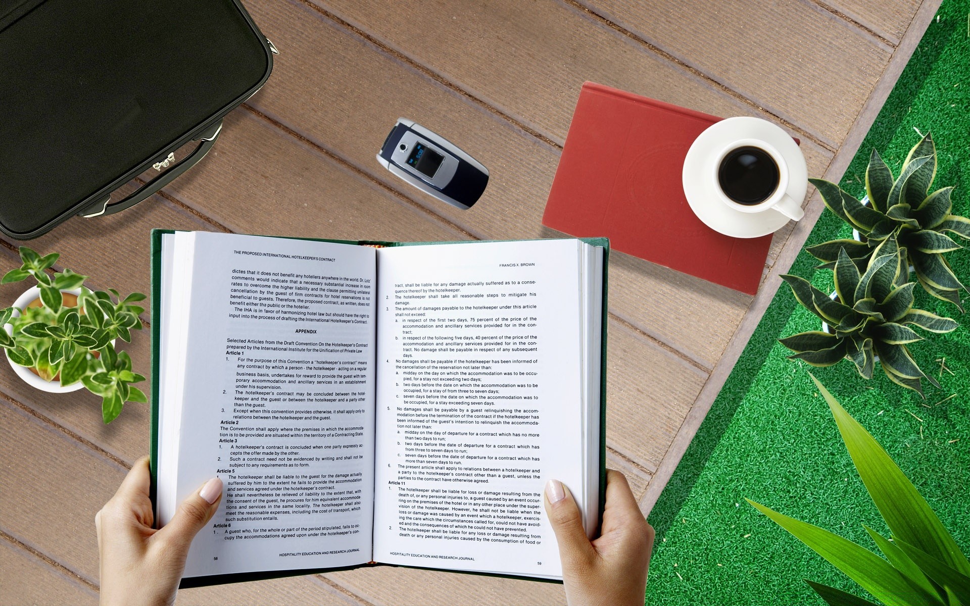 First-person photo of a girl reading a book on her desktop with a cup of coffee