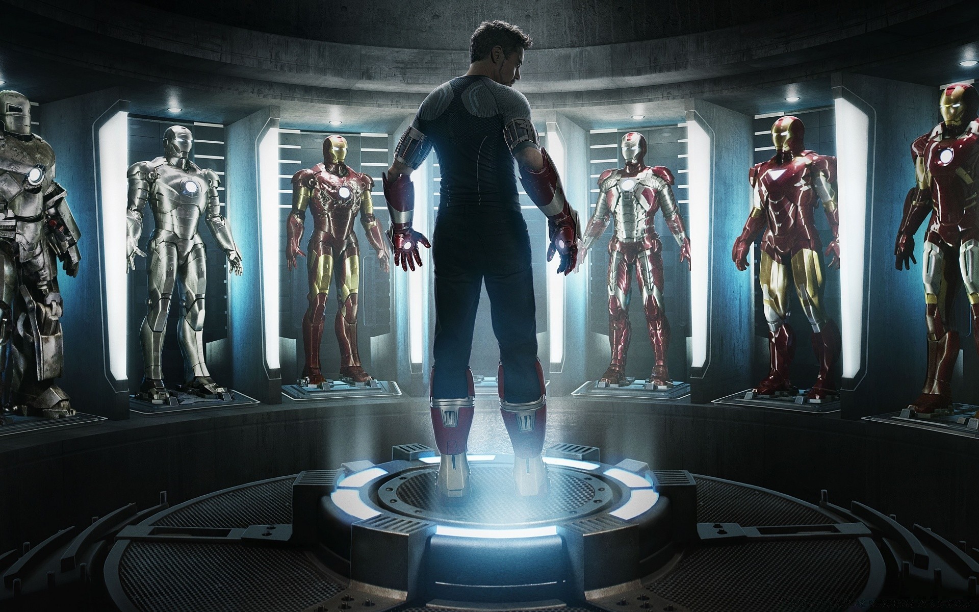 Iron Man surrounded by costumes