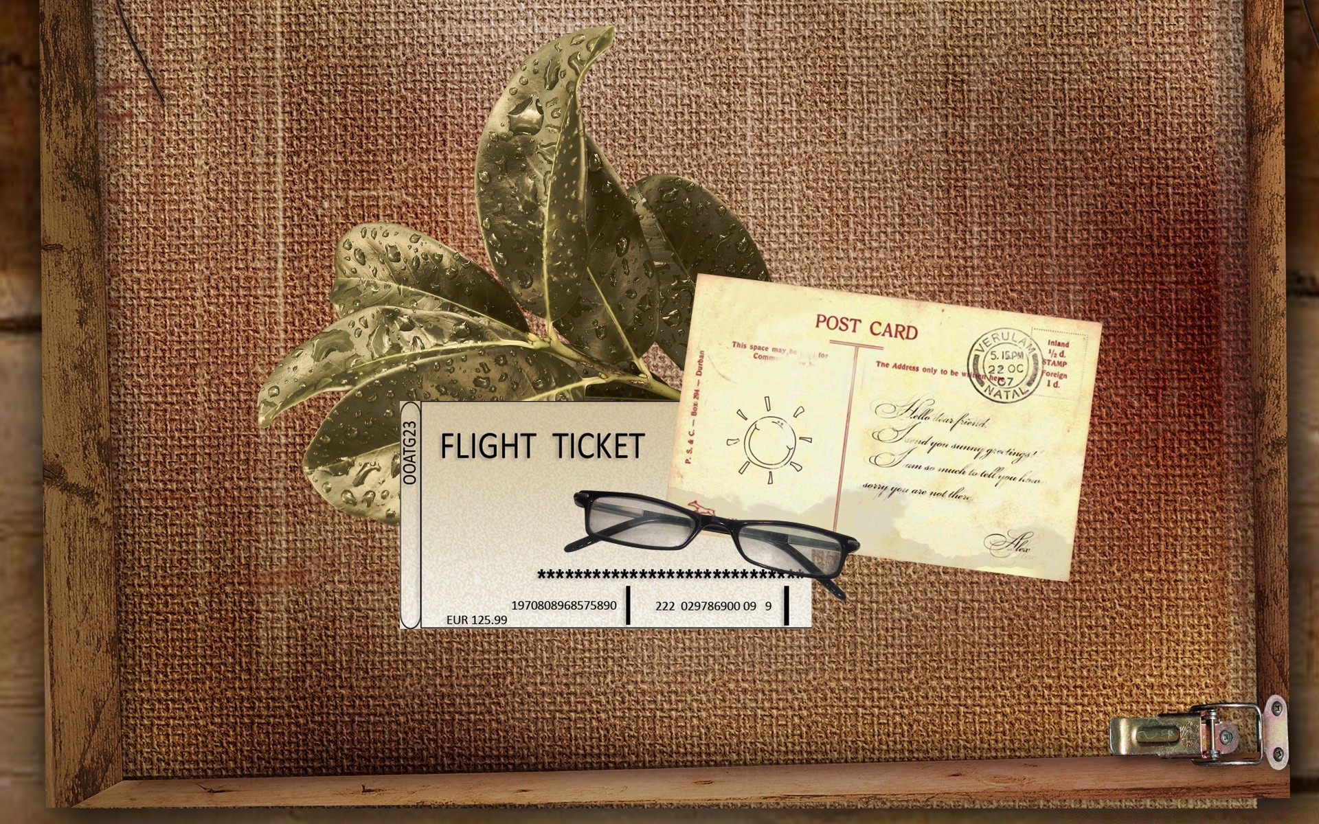 Postcards on the background of a strange box