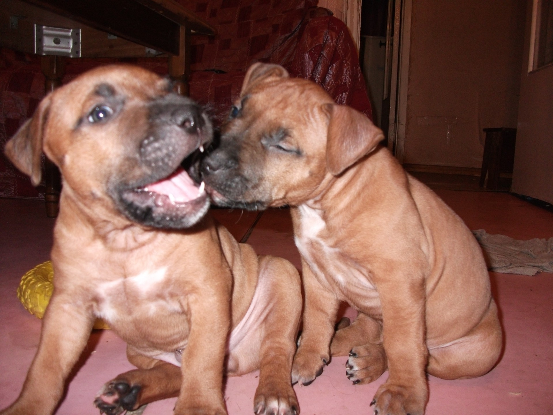 Two puppies frolic indoors