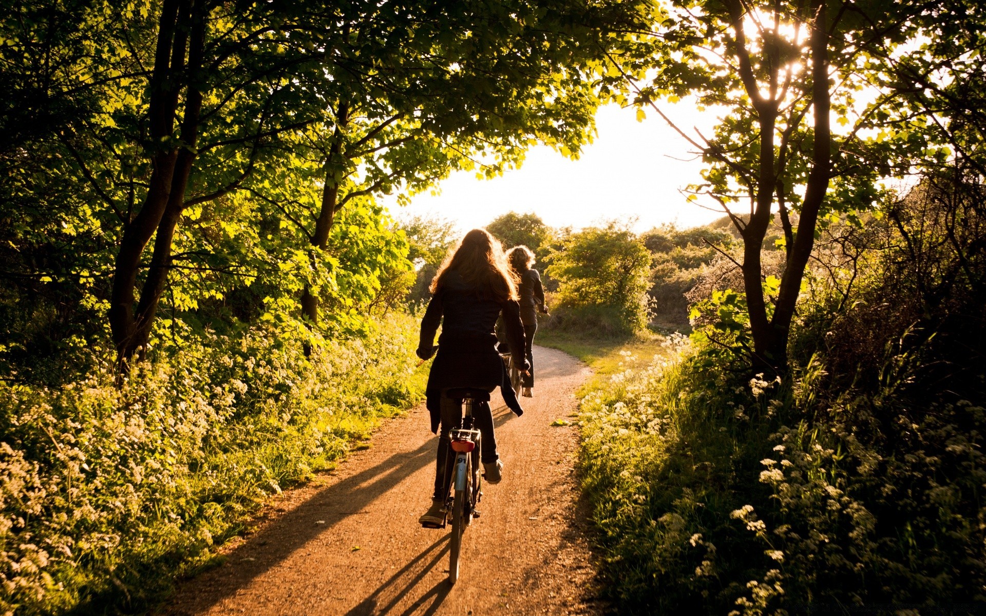 A cyclist rides in the evening at sunset