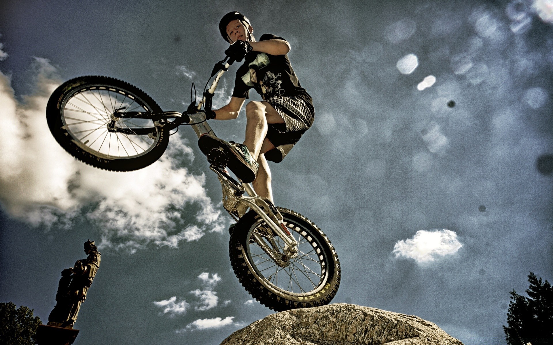 A biker on a bicycle does sports