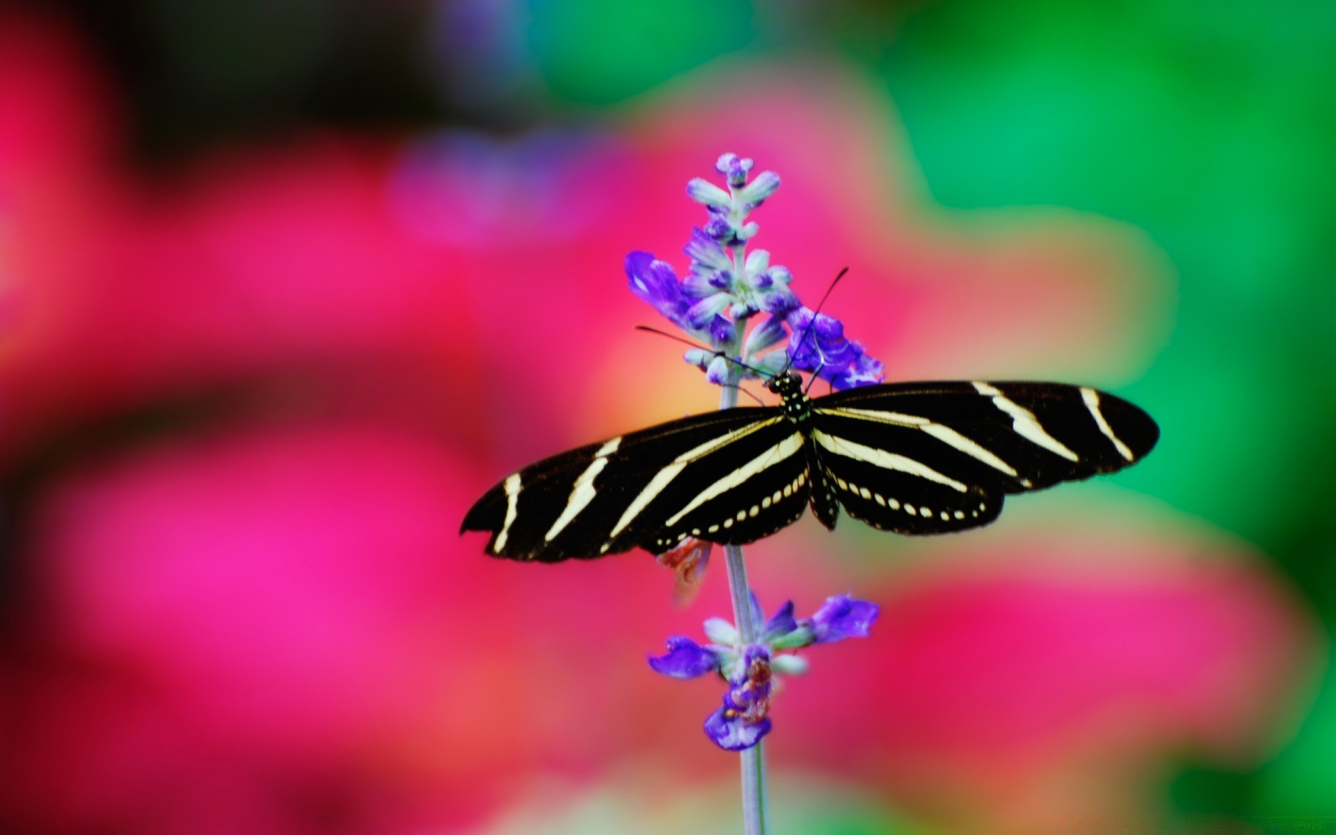 Green butterfly on a stem with purple flowers