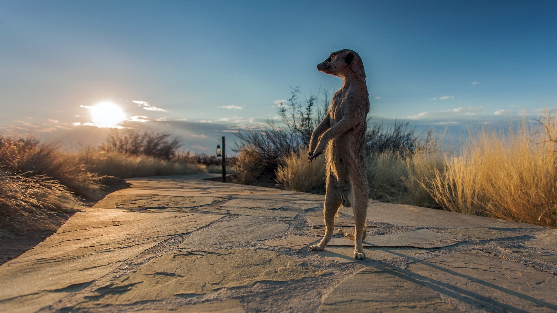 The jerboa stands on its hind legs and looks over the horizon