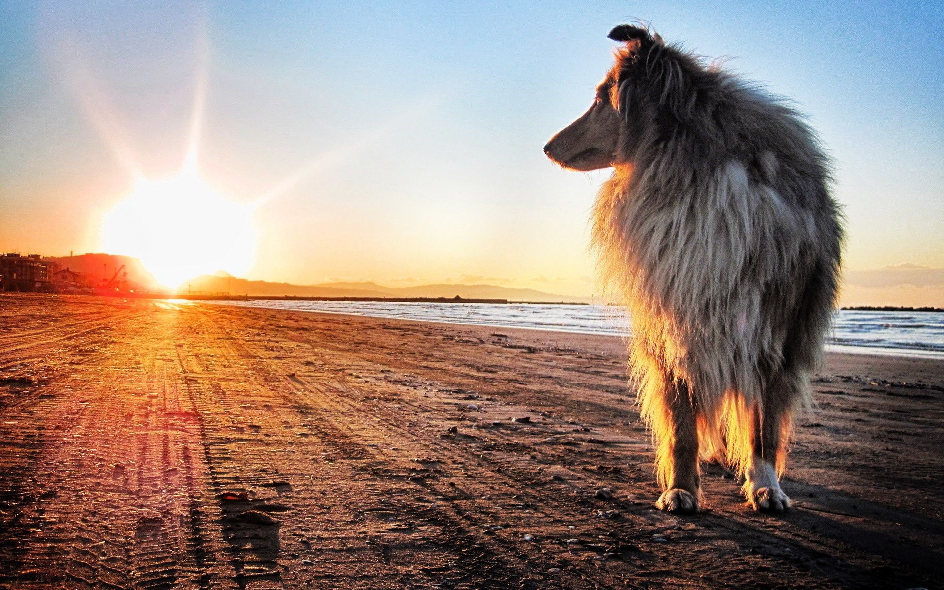 A dog at sunset in a field in nature