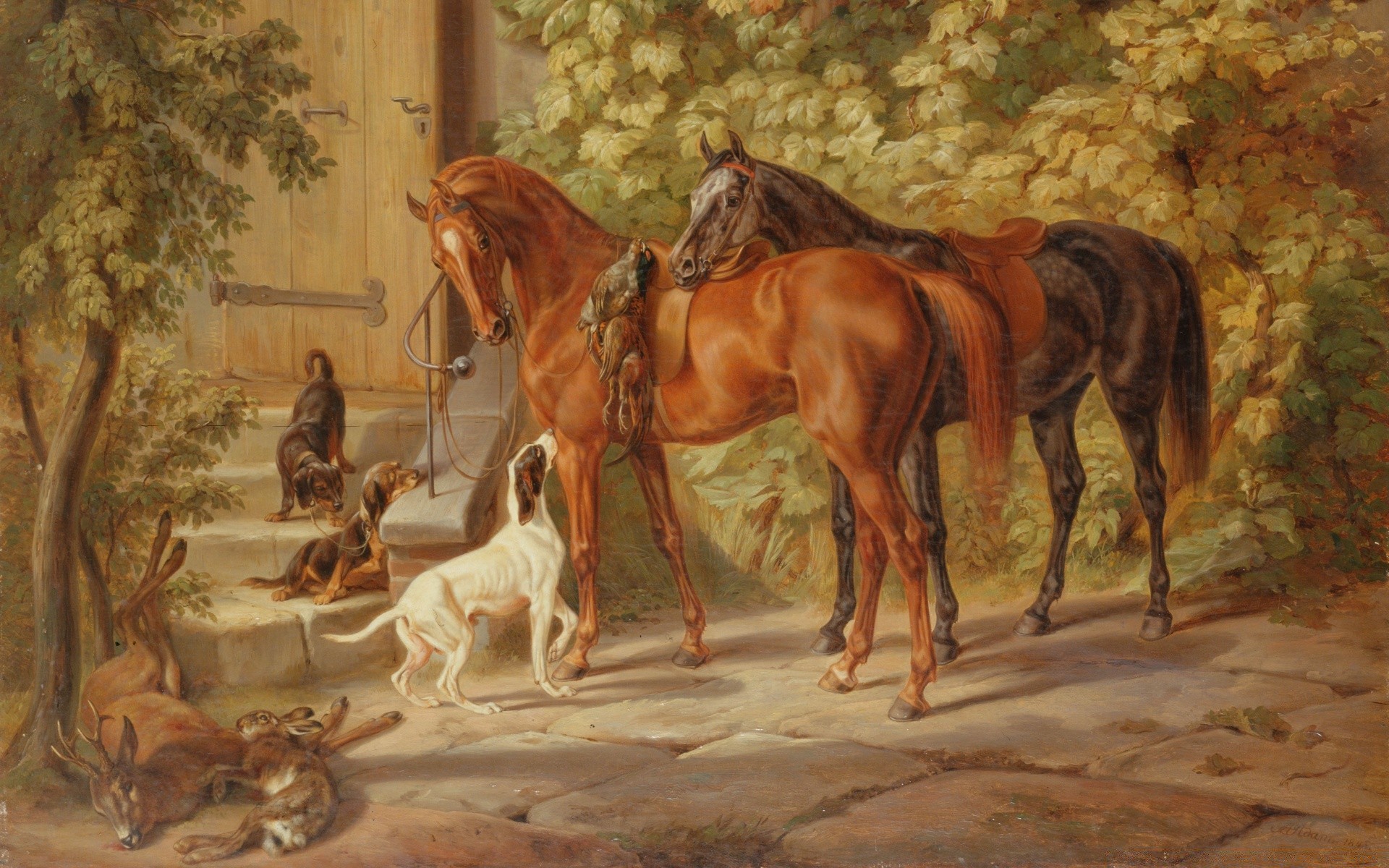 Cavalry and a dog on a background of trees
