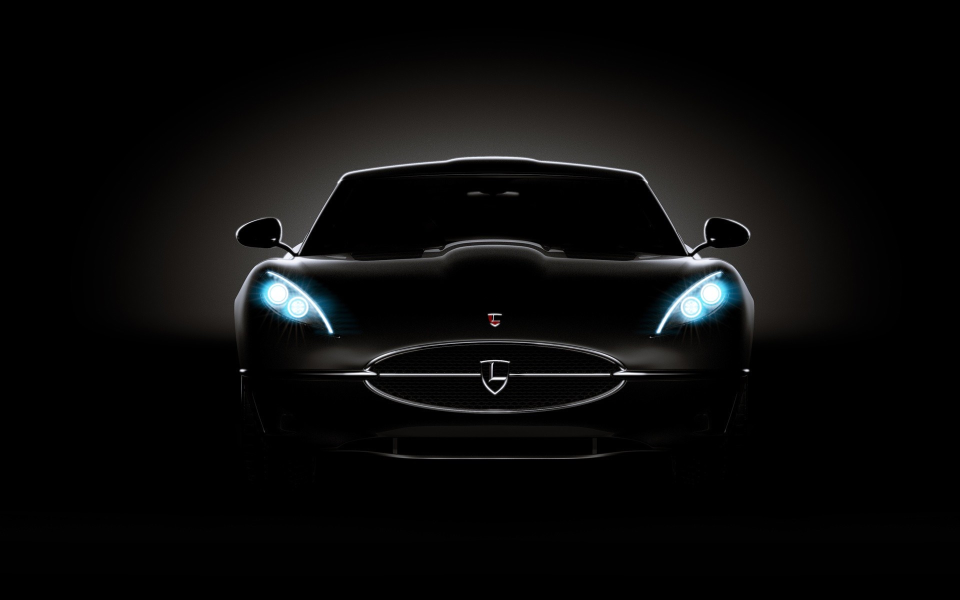 A bright scarlet car polished to a shine against a background of gray concreteA bright scarlet car polished to a shine against a background of gray concrete