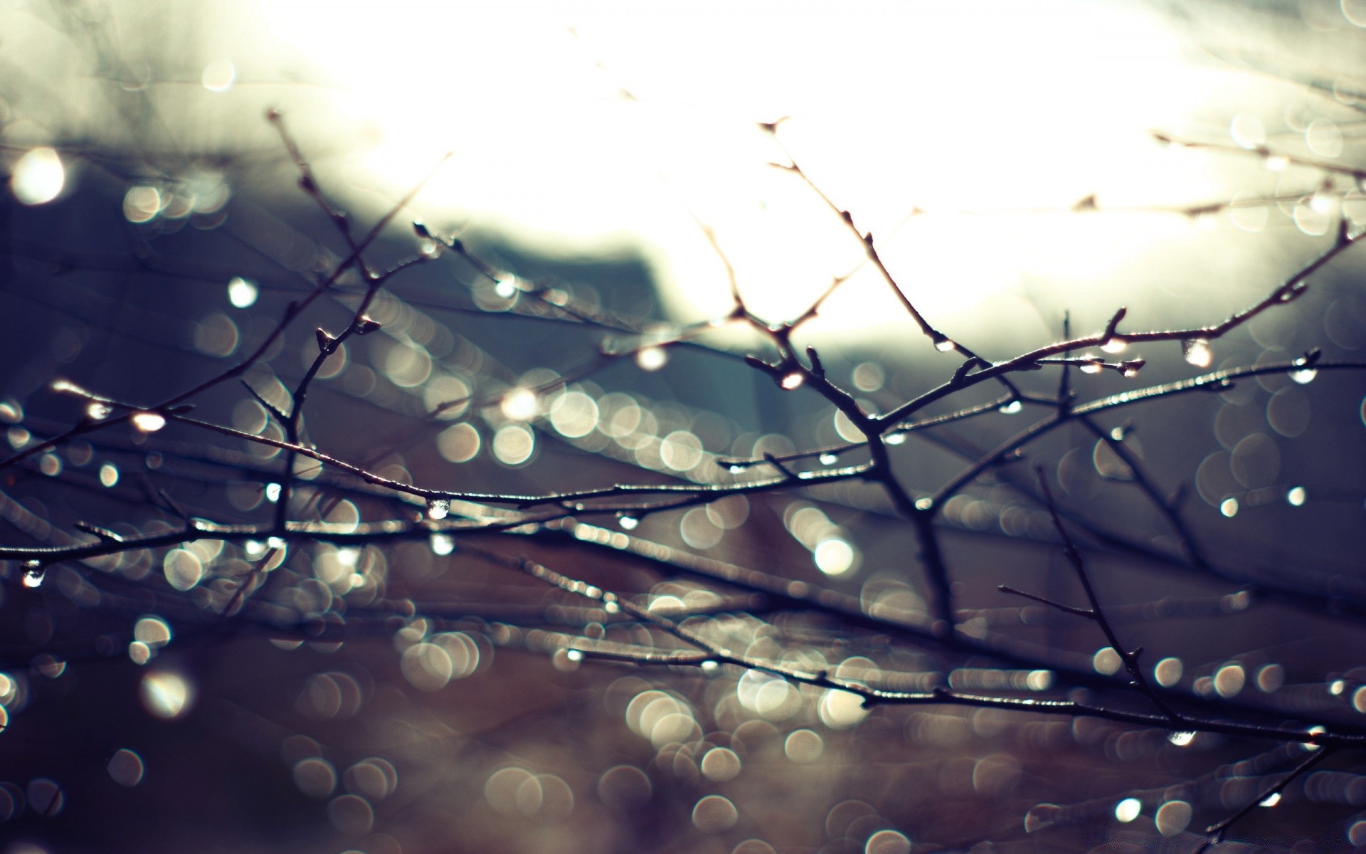 A wet tree branch in drops without leaves on a blurry background