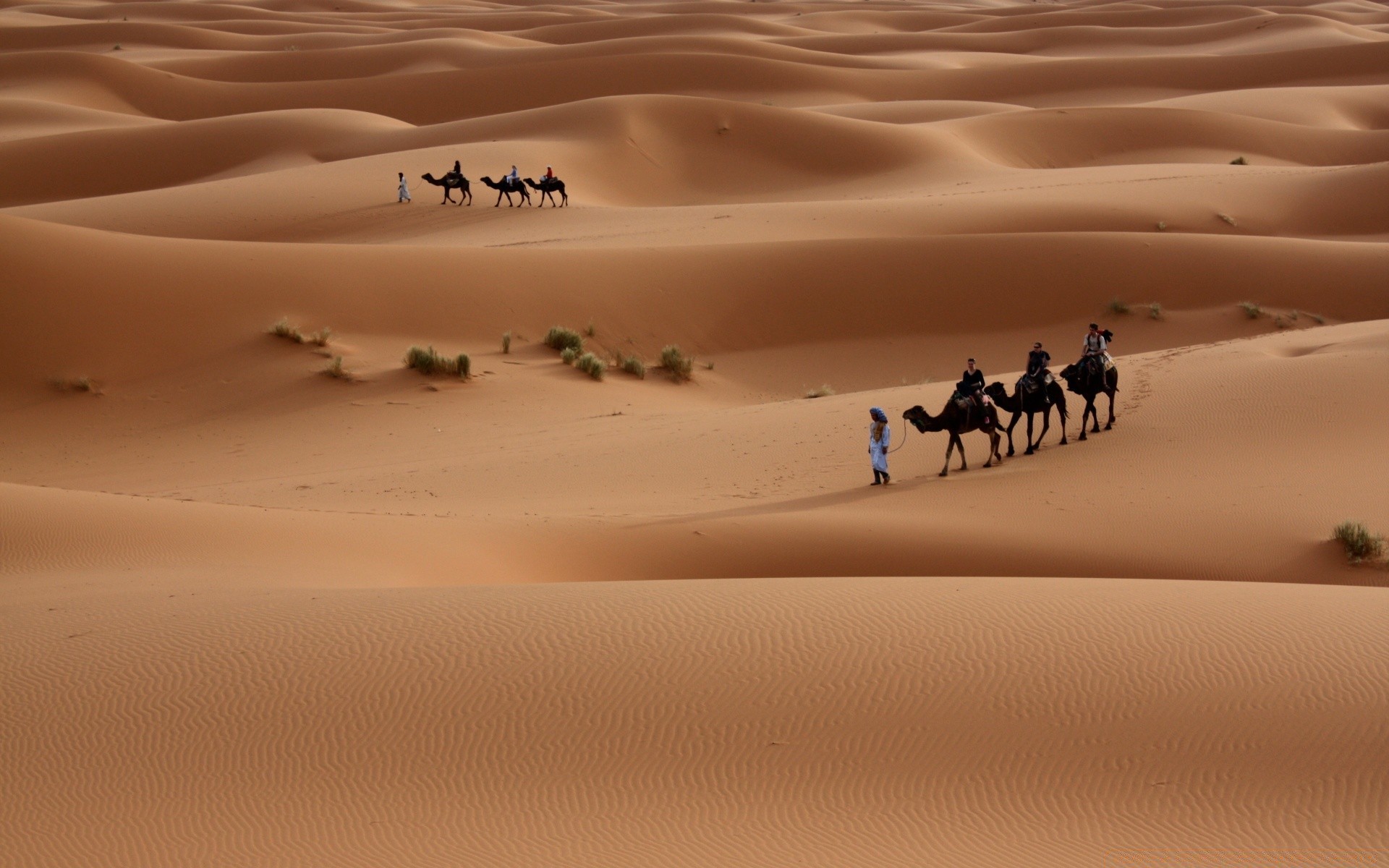 Tired camels are led in the dry desert