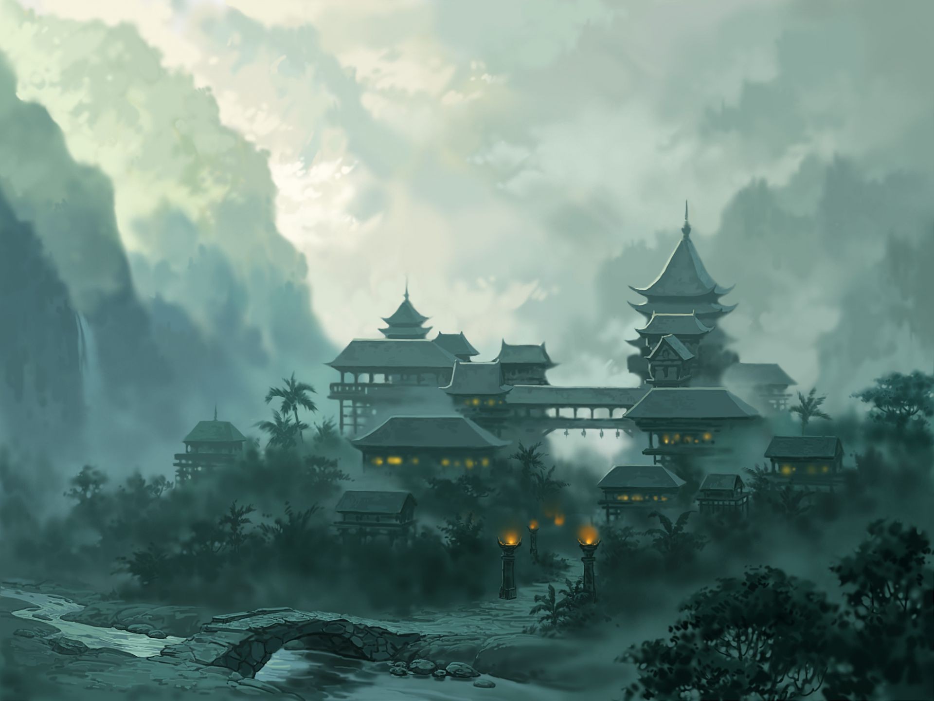 Jade dynasty river landscape fog city mountains bridge lights