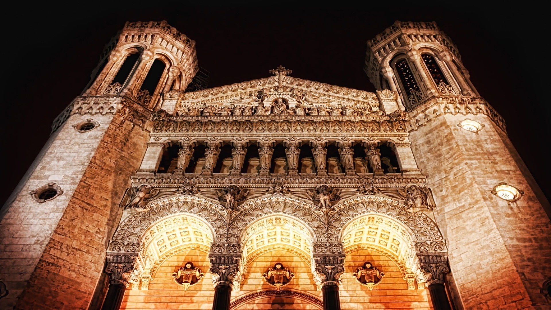 The ancient building is illuminated by lanterns