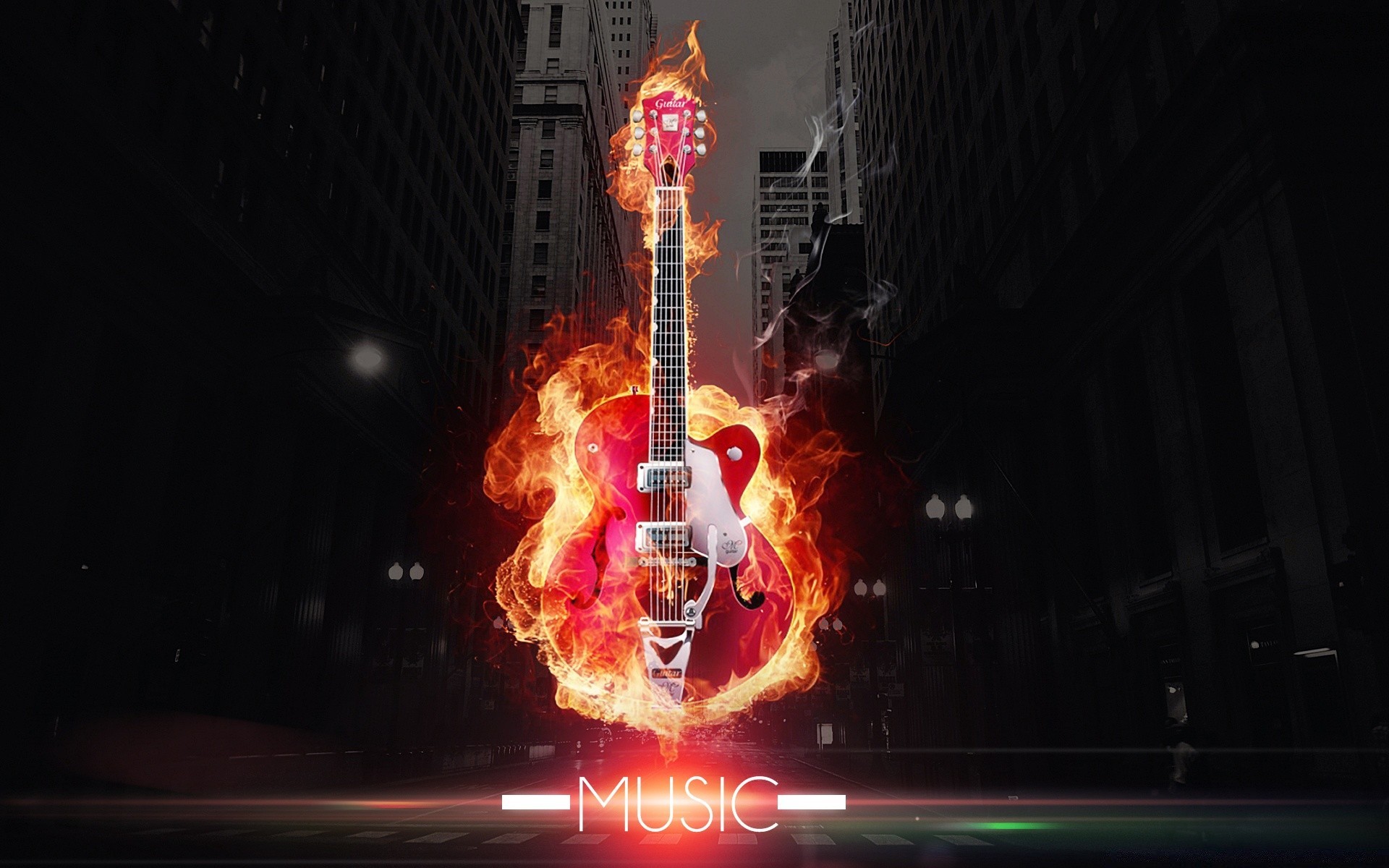 Guitar in flames on the background of skyscrapers