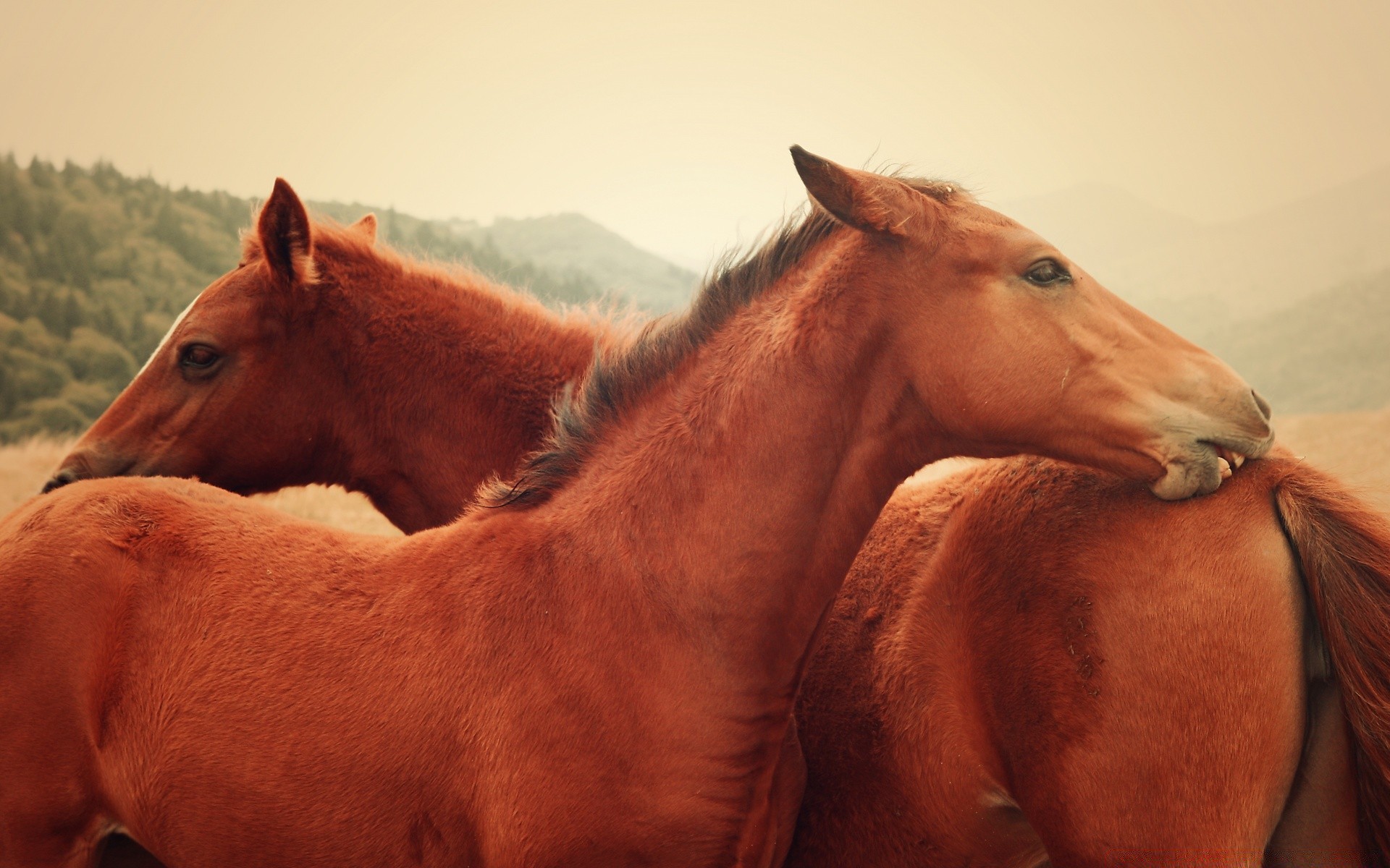 Beautiful two horses on a landscape background