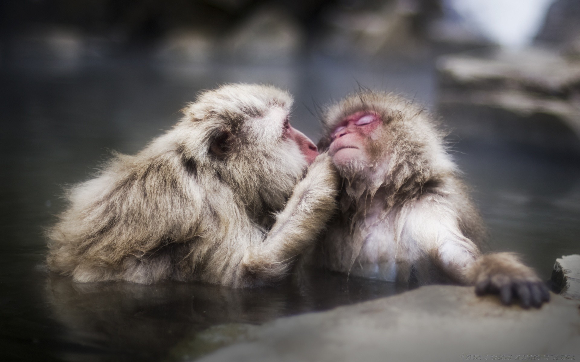 Two monkeys wash in the water