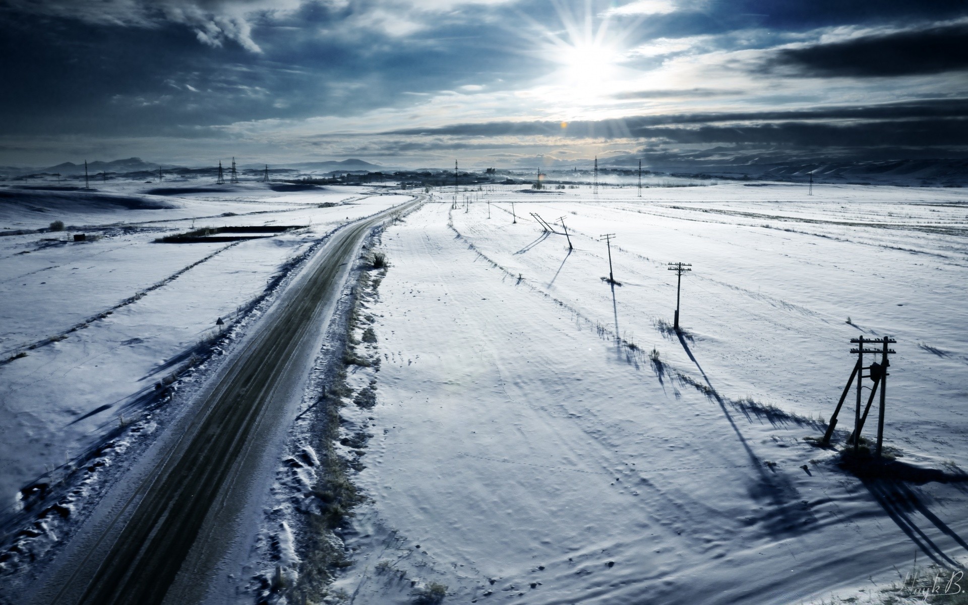 Winter evening road into the distance