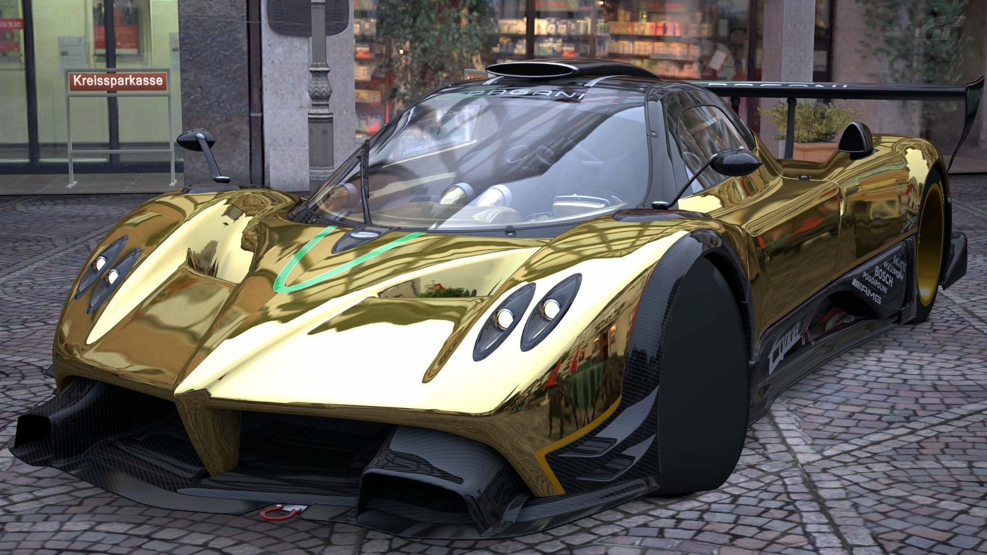 A golden-colored racing car near a cafe