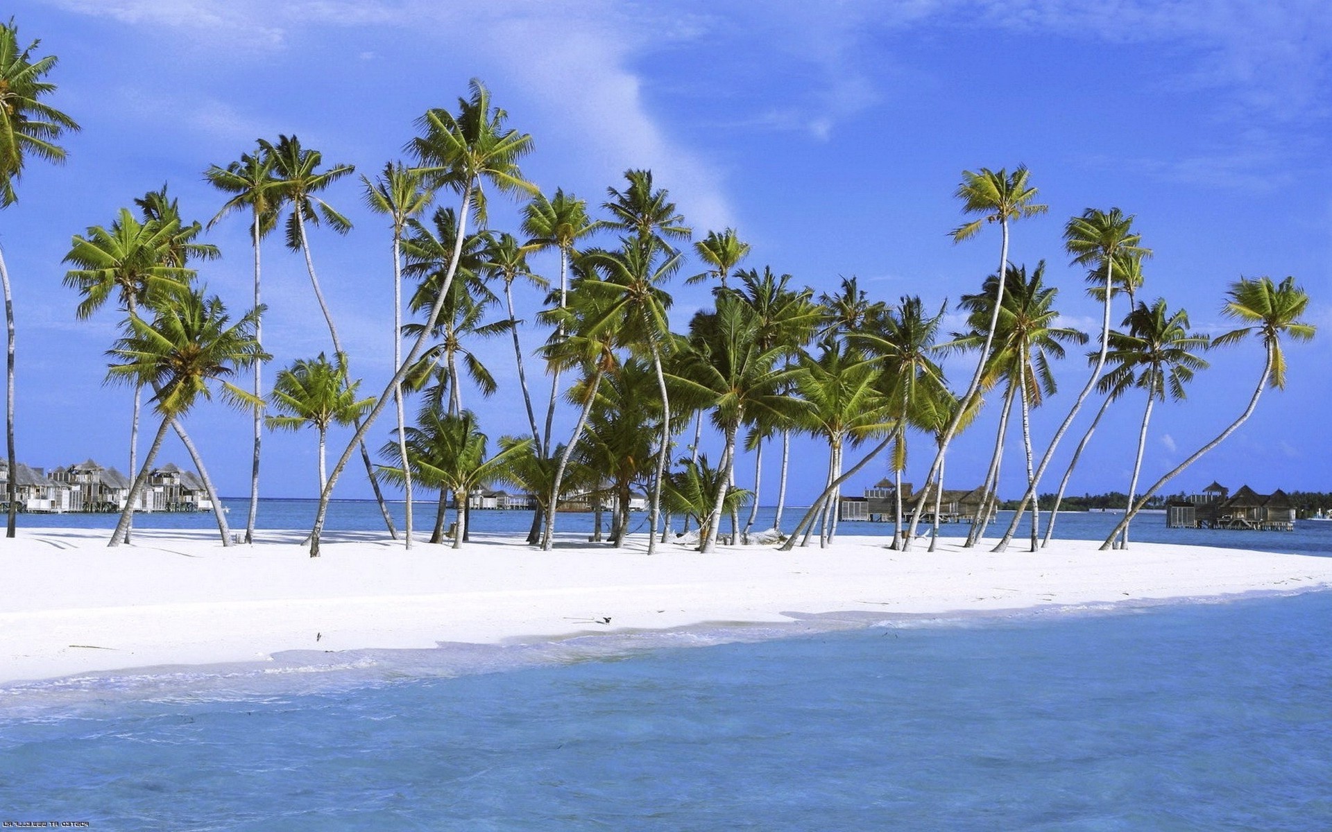 A tropical island with palm trees and a beach