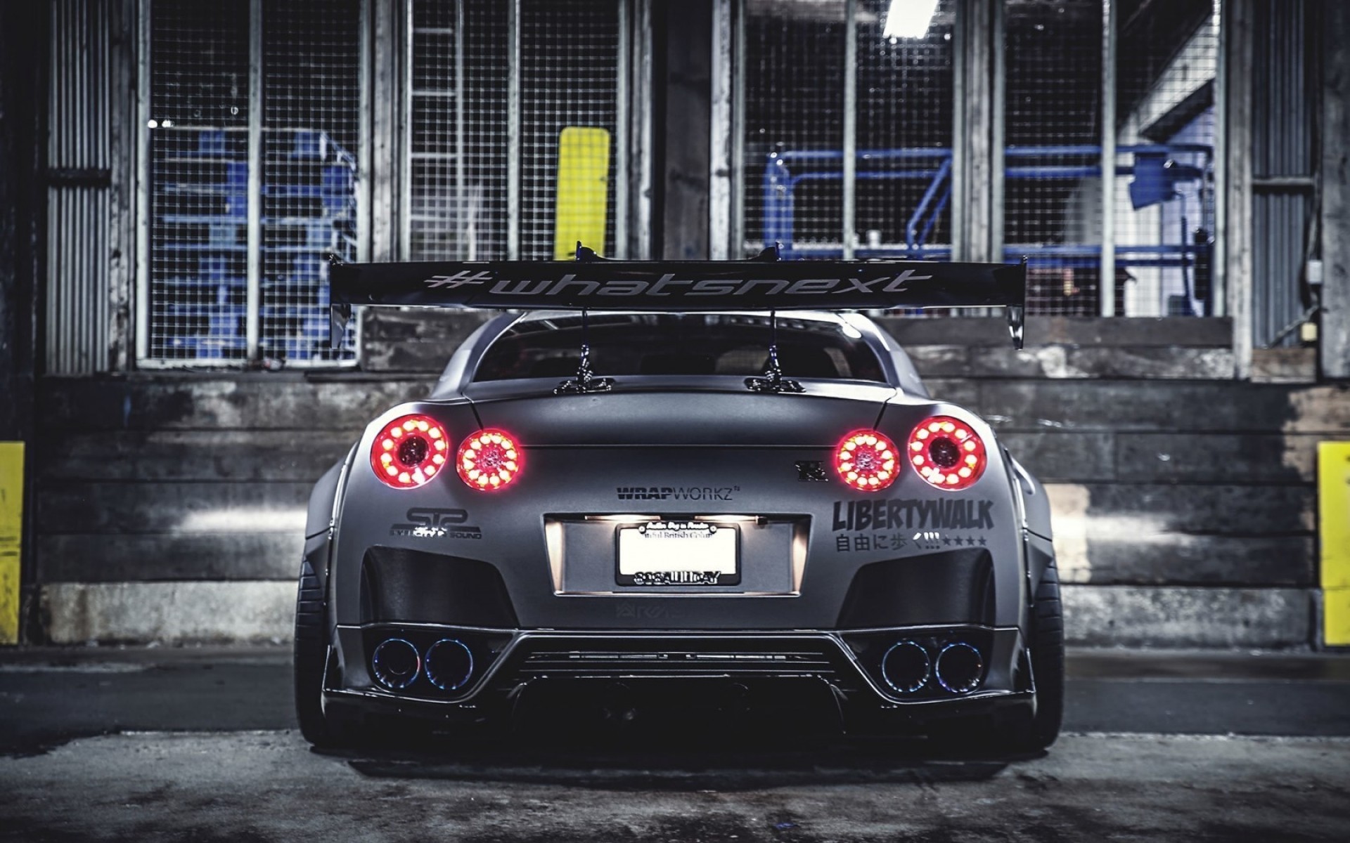 A standing racing car with its headlights on