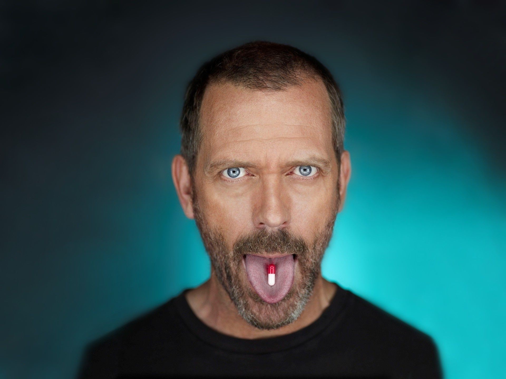 Actor with a pill in his mouth, dark background