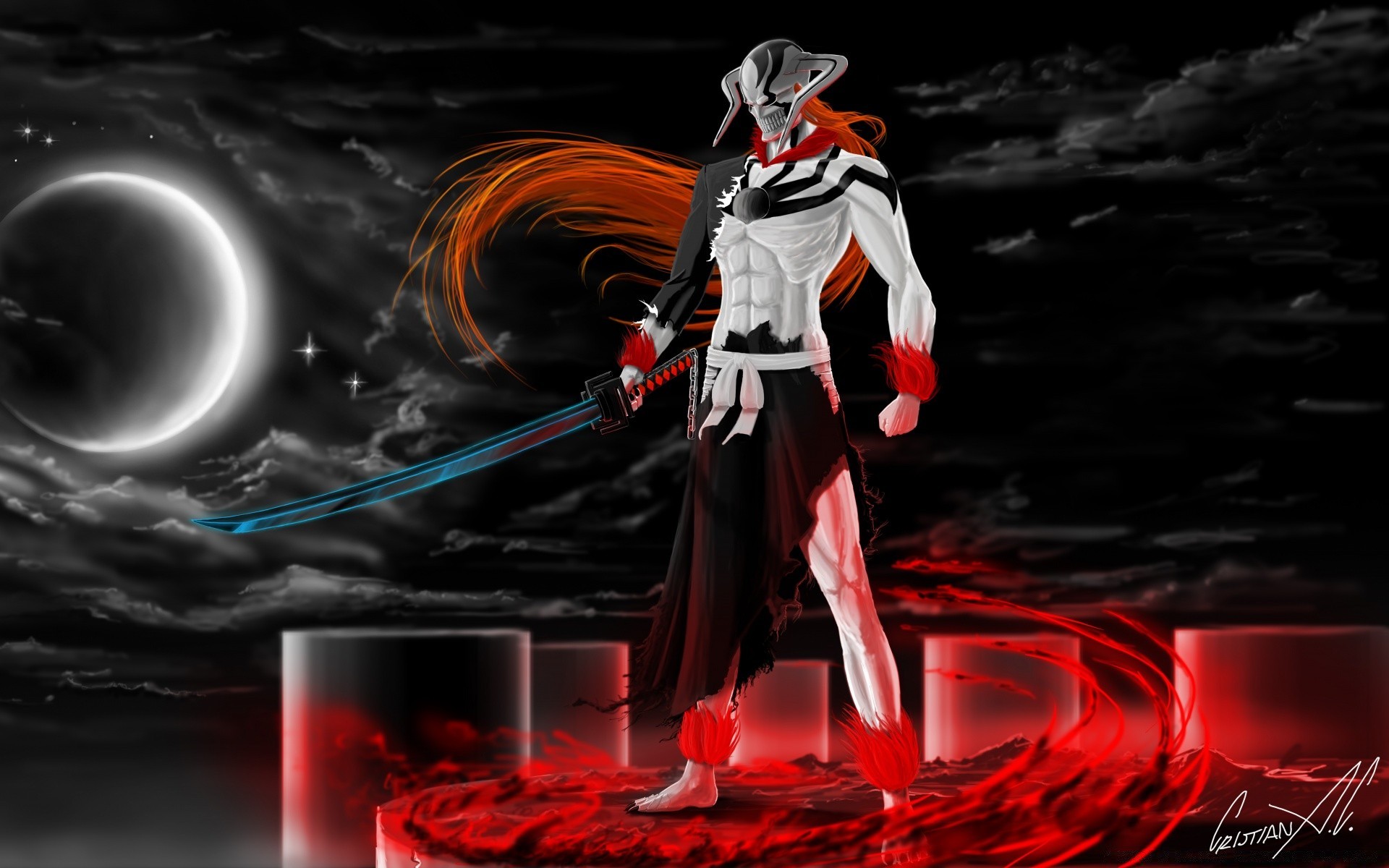 Fantasy, a red-haired hero in a helmet with horns, holding a Japanese sword in his hand
