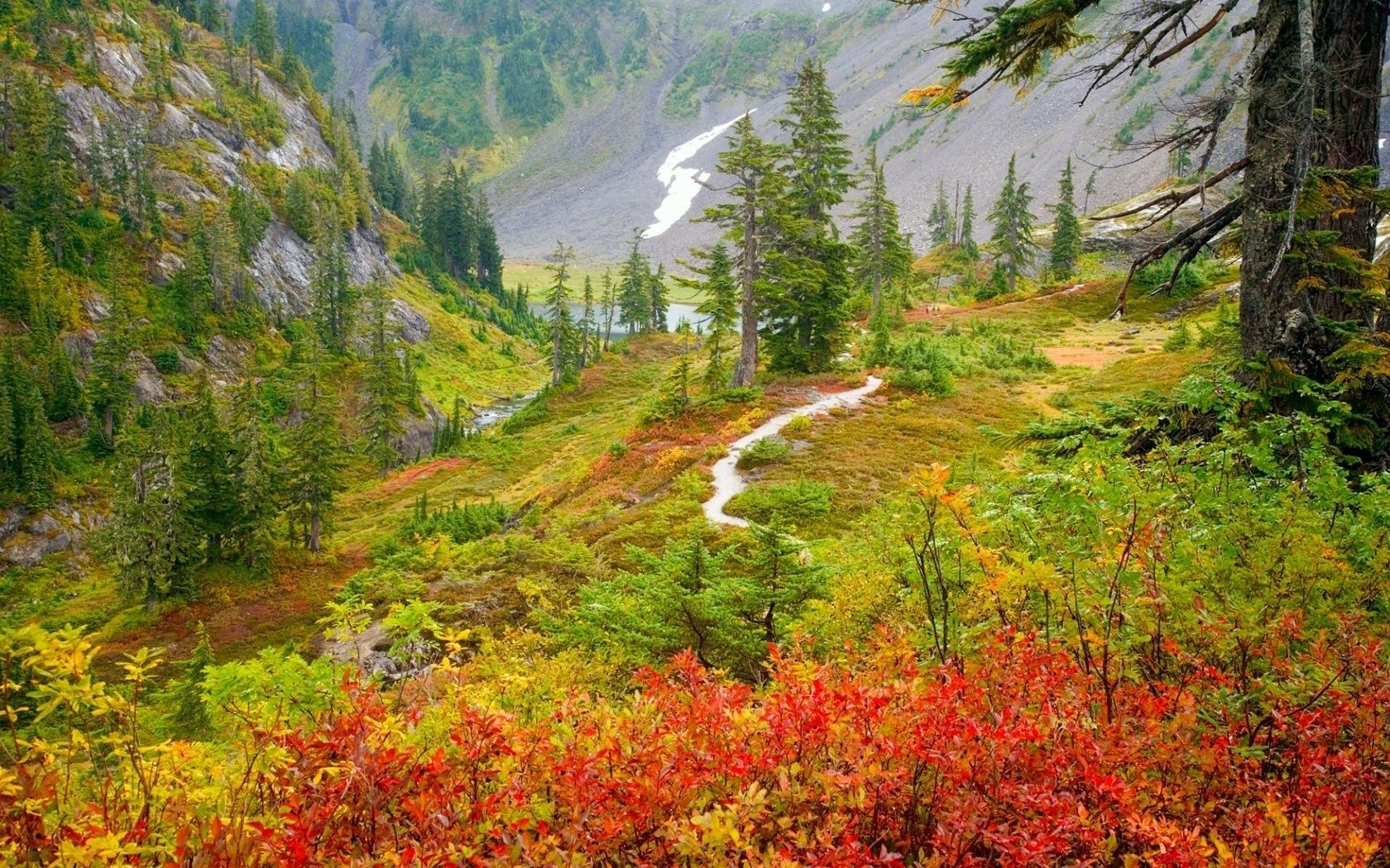 An alley strewn with bright maple leaves