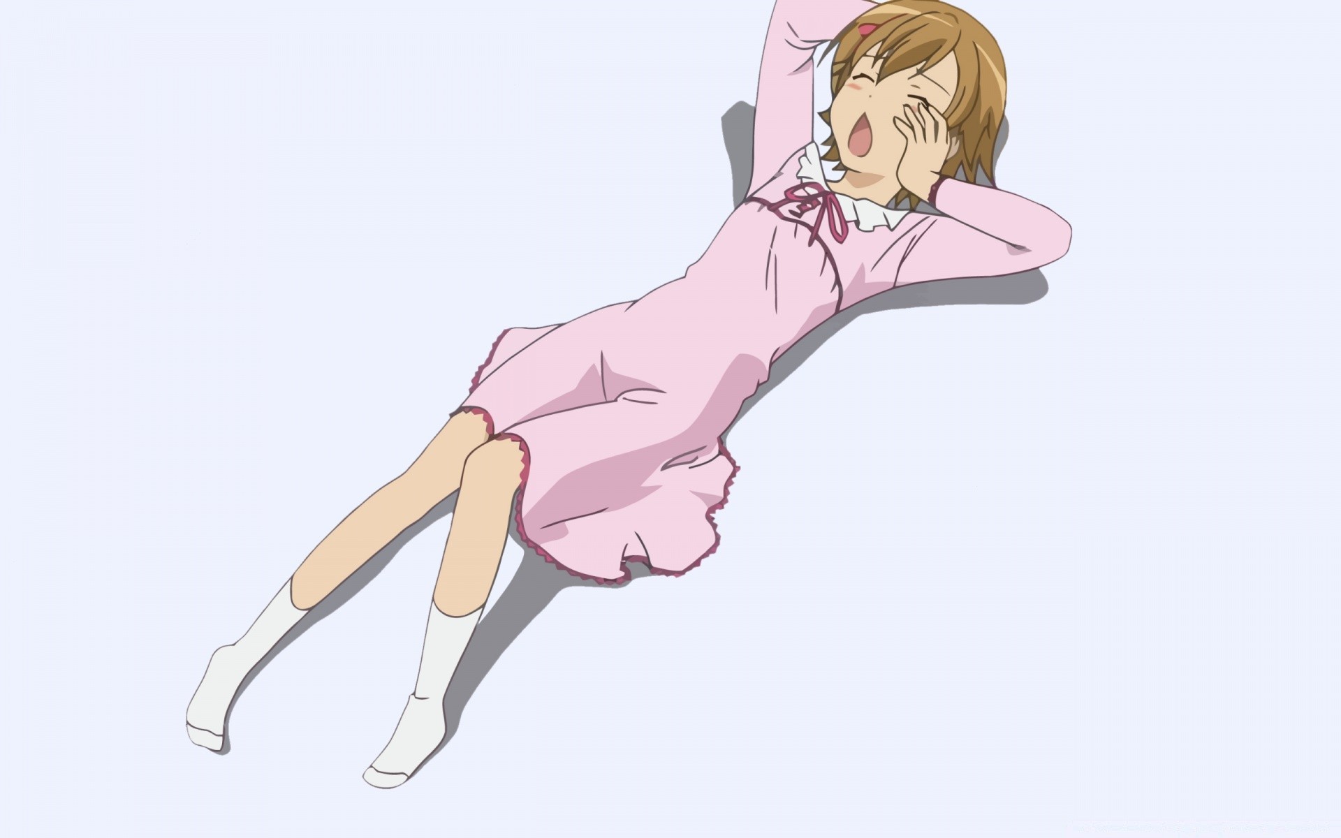 A girl in a pink dress lies and yawns anime