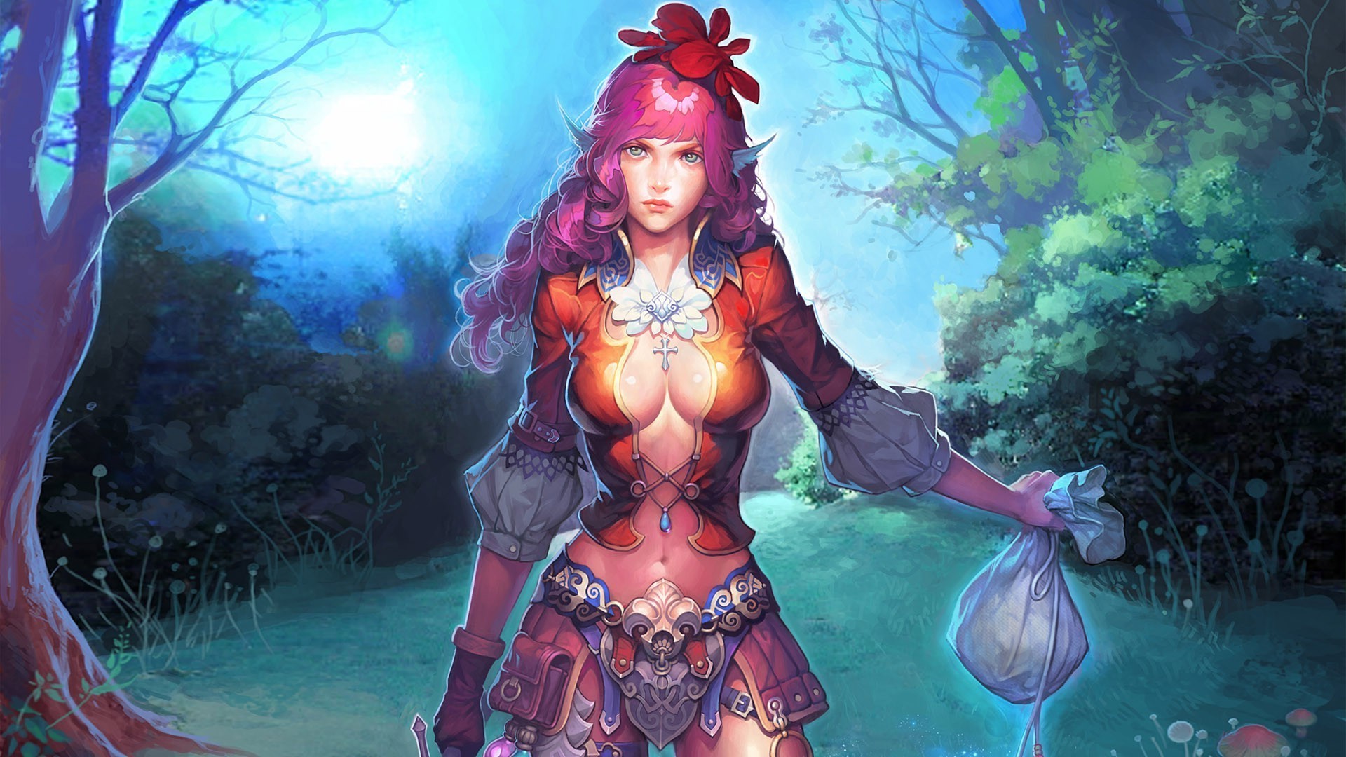 Painted pink-haired elf with a bag