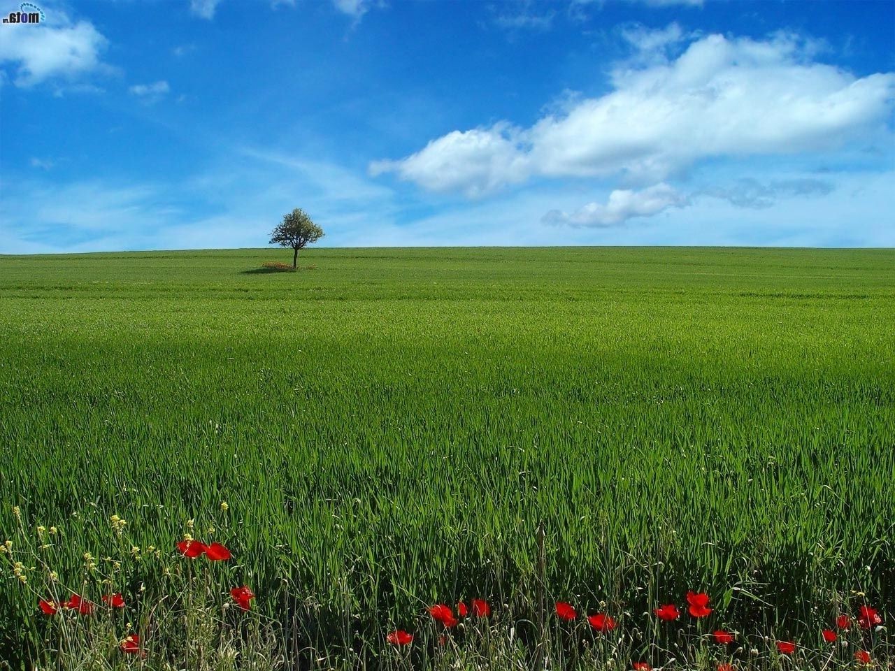 The summer field is green and snow-white clouds in the blue skyThe summer field is green and snow-white clouds in the blue sky