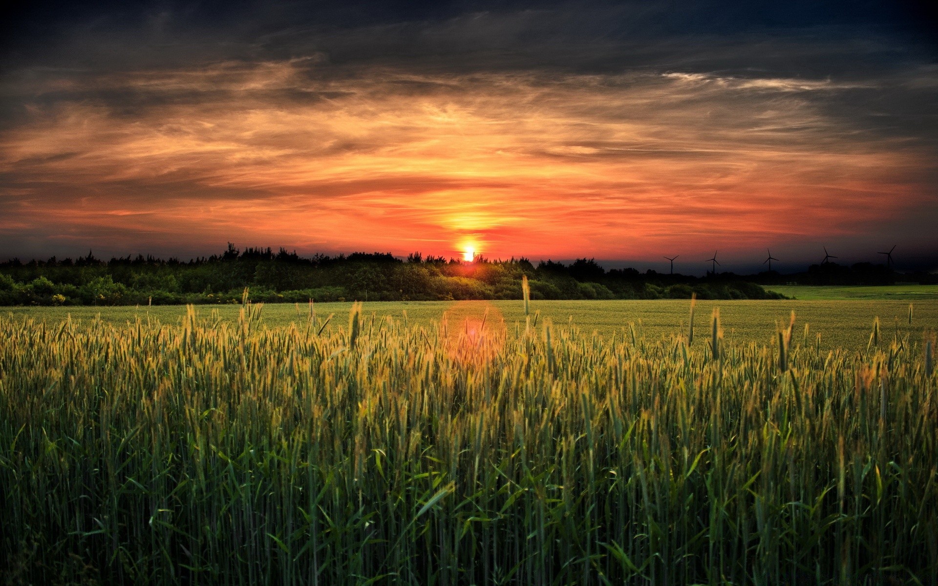 A warm sunset in the fields with wheat