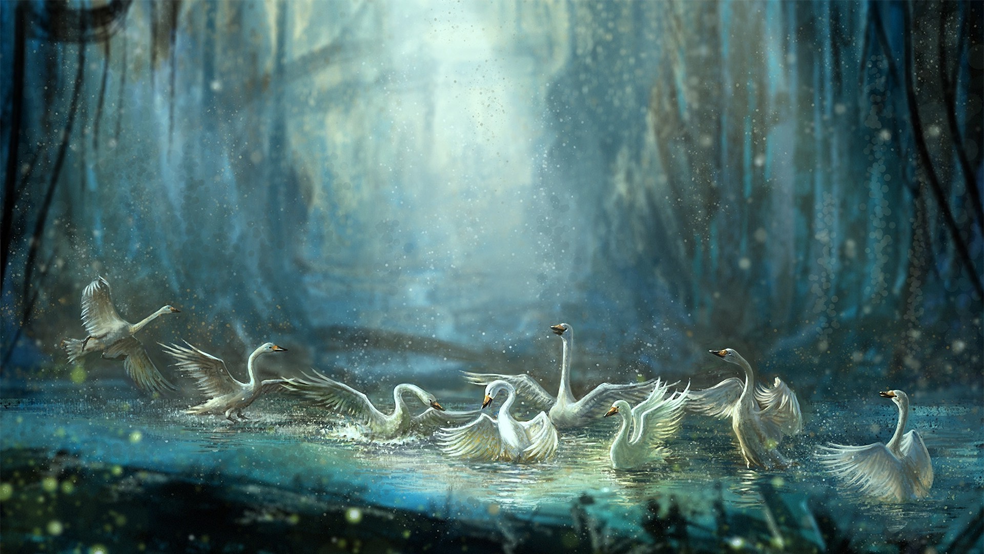 Swans splash in clear water
