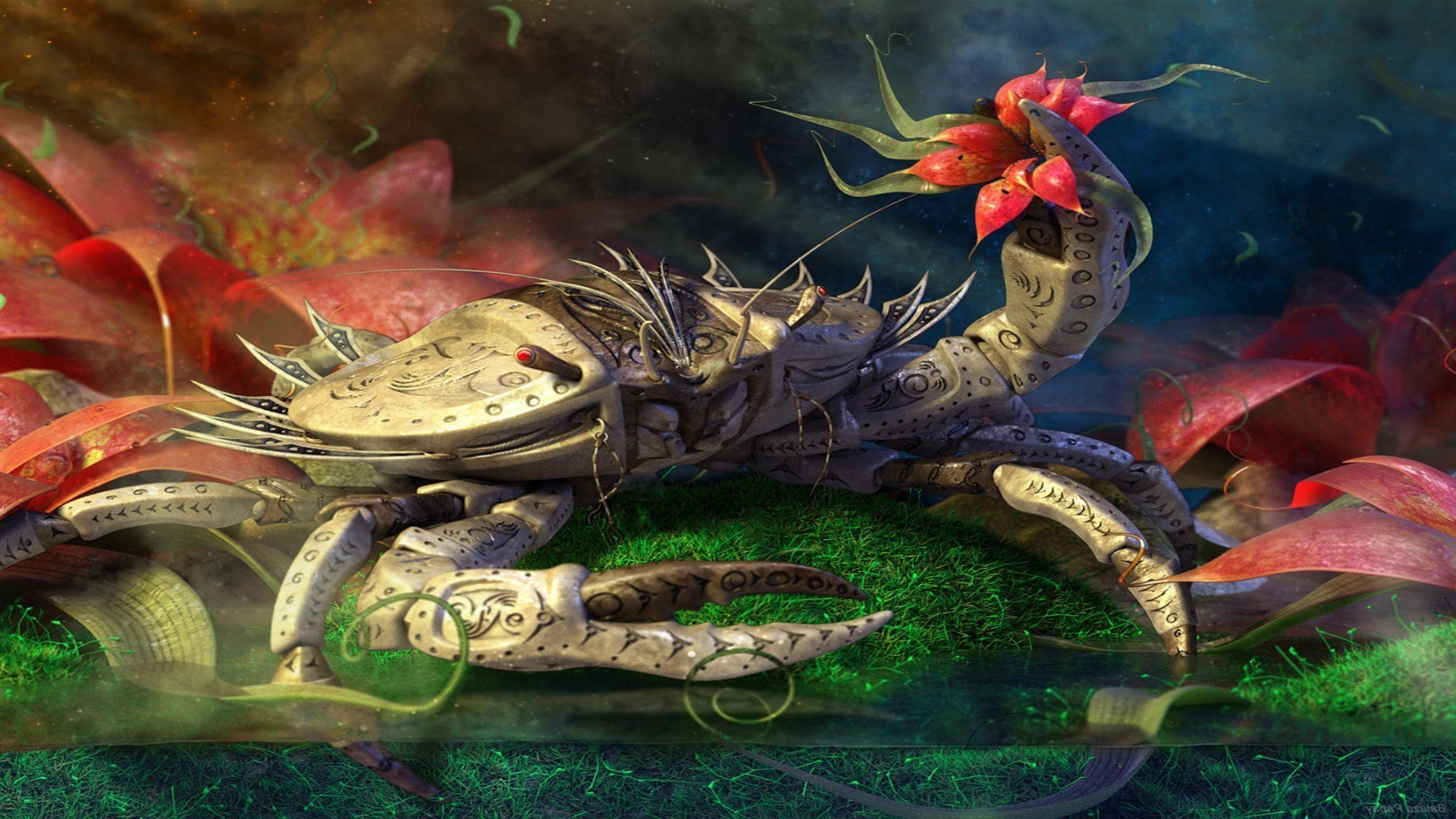A crab holds a flower in its claw