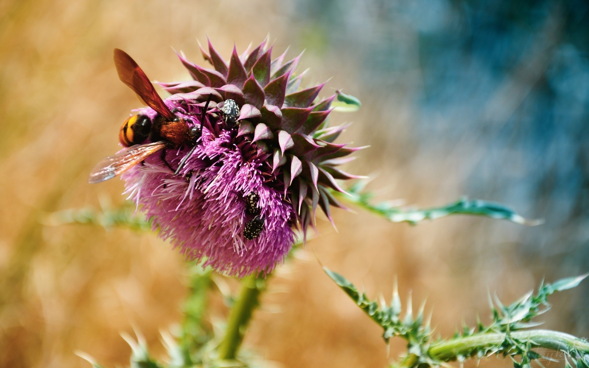 A bee is sitting on a burdock flower