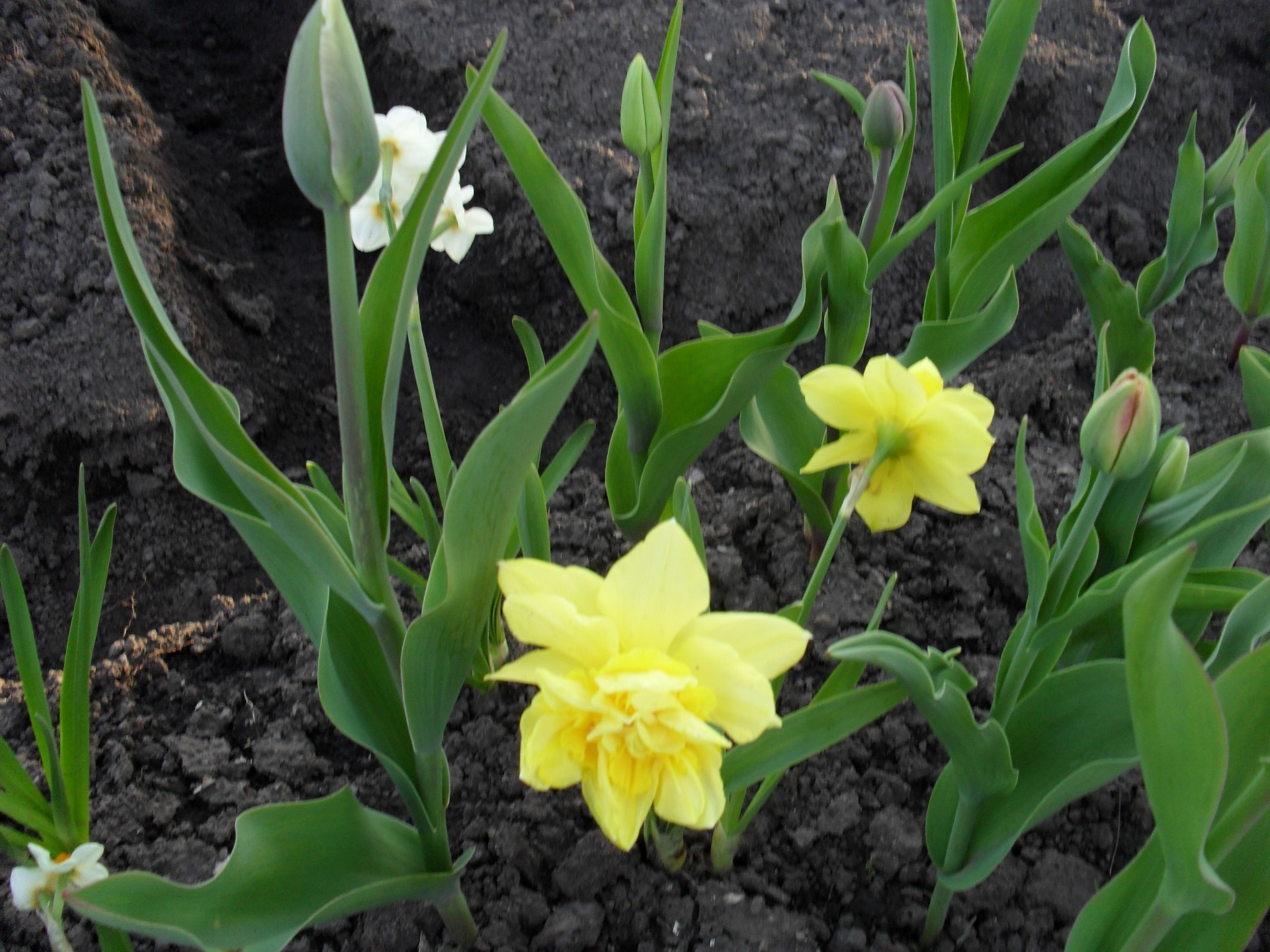 Spring, a flowerbed with yellow daffodils and red tulips