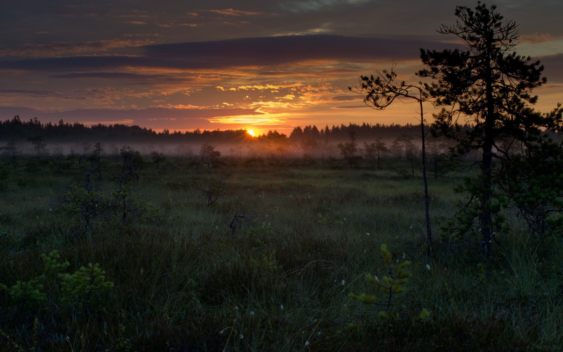 Incredible sunset in a foggy field