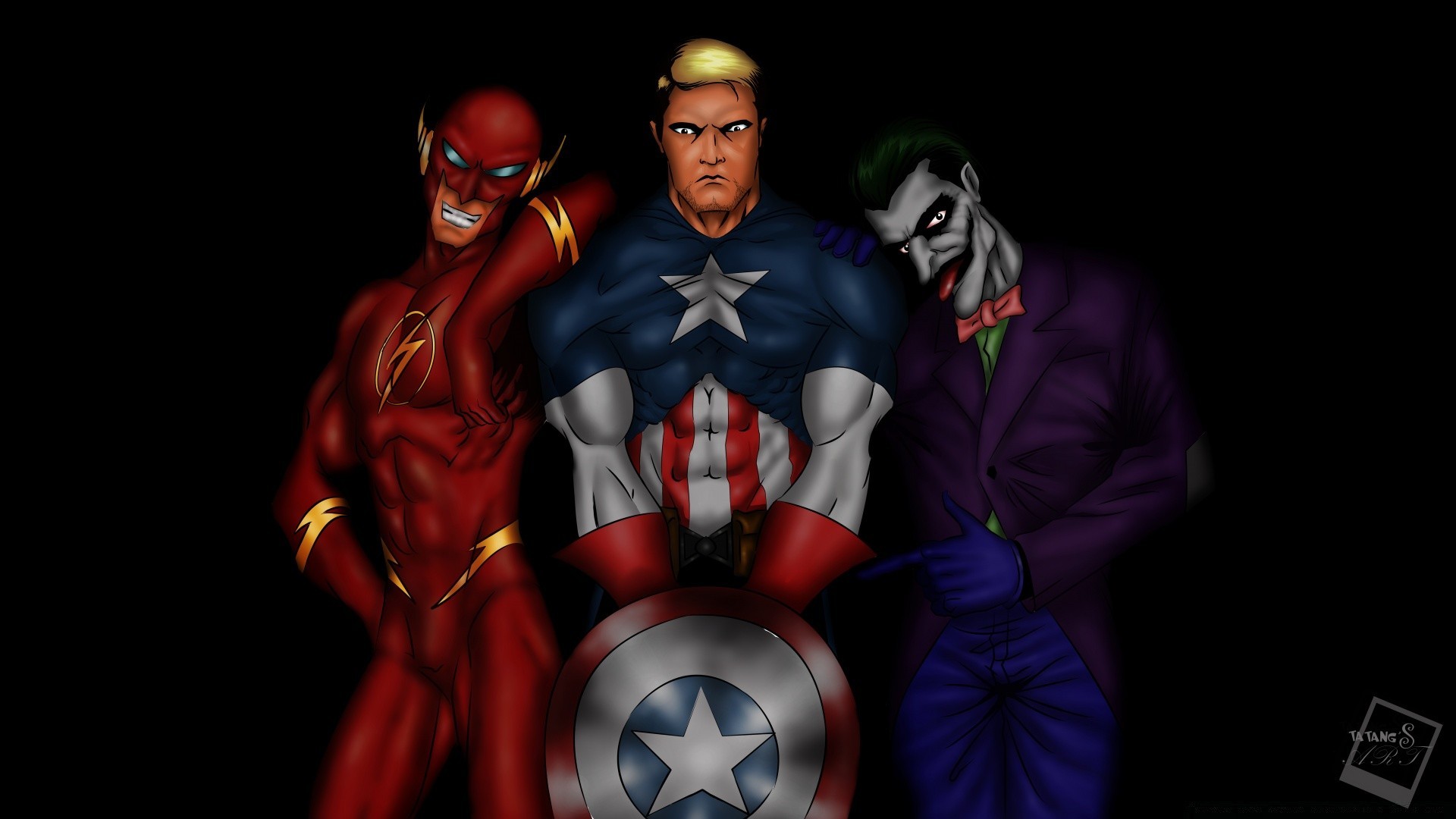 Three superheroes on a black background, captain america, the joker and the flashThree superheroes on a black background, Captain America, the Joker and The Flash