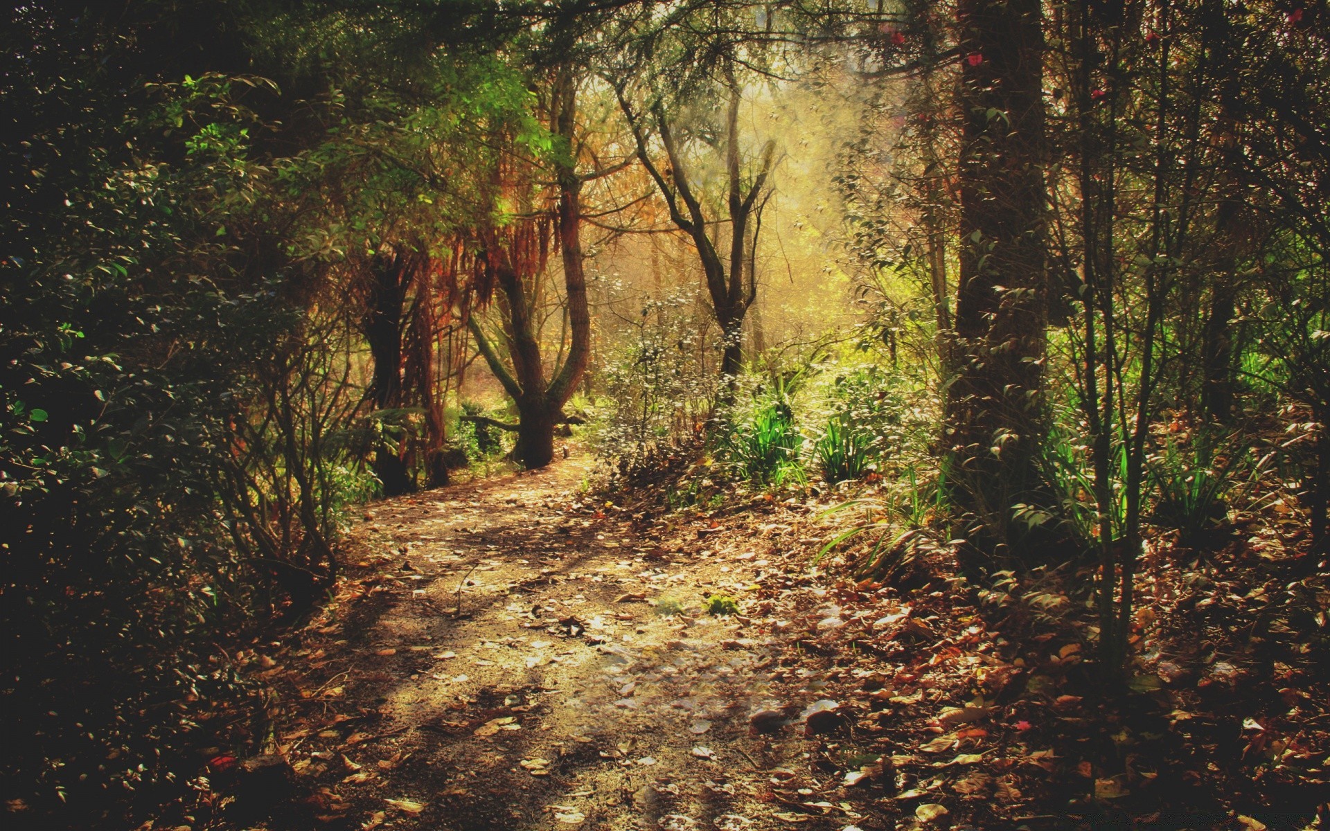Moss-covered trees in a gloomy forest illuminated by the sun