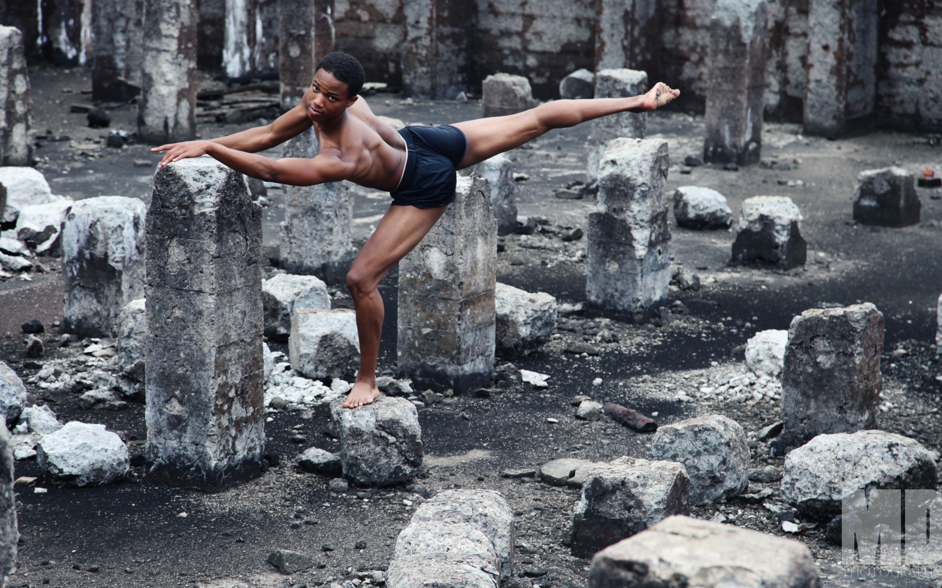 A man does yoga in the fresh air among the stones