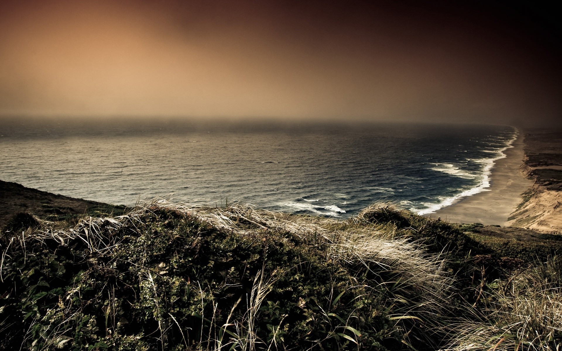 A grassy edge in front of a sandy cliff and an endless gloomy sea