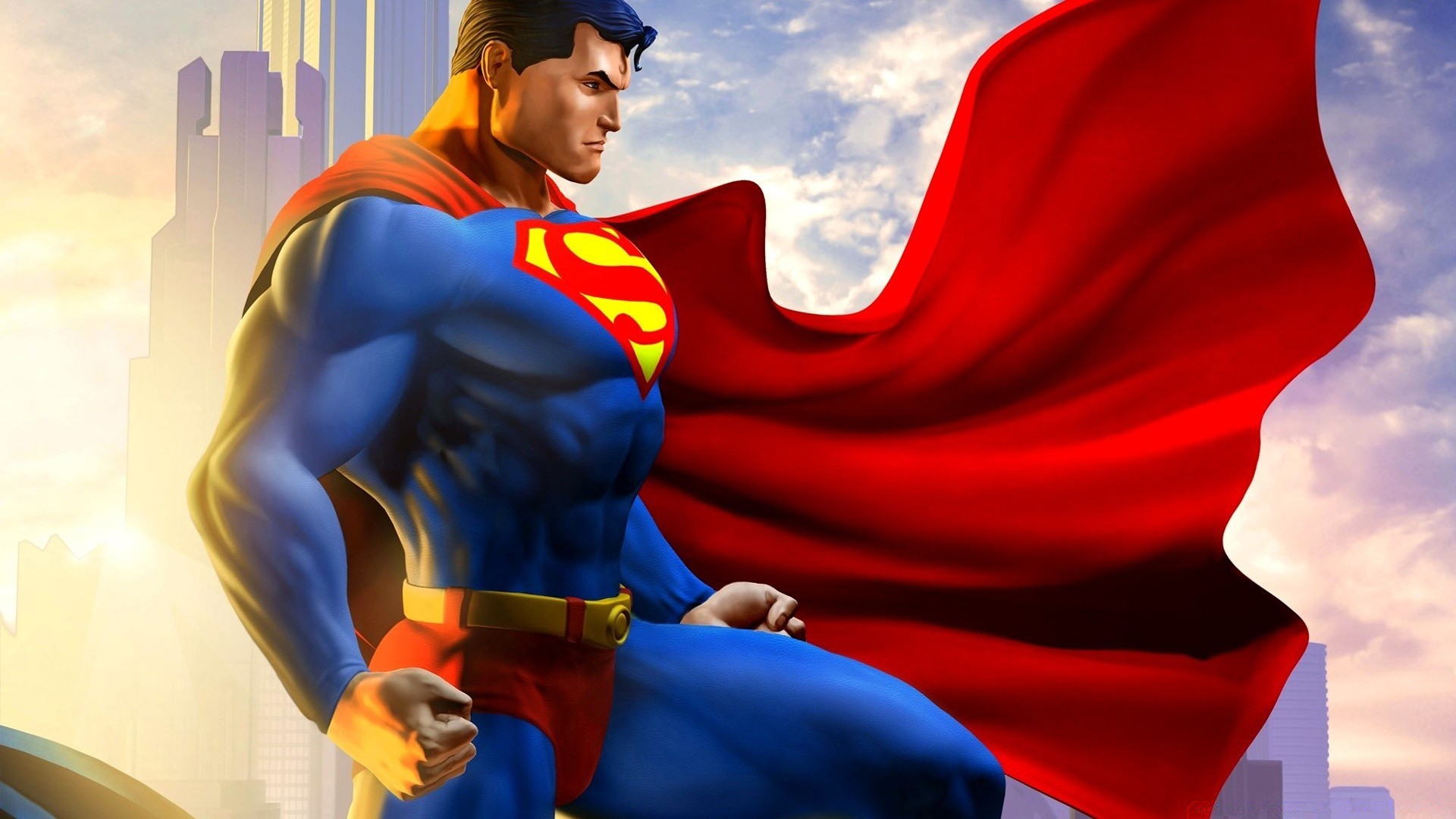 Superman in a fluttering red raincoat against the backdrop of megalopolis skyscrapersSuperman in a fluttering red raincoat against the backdrop of megalopolis skyscrapers