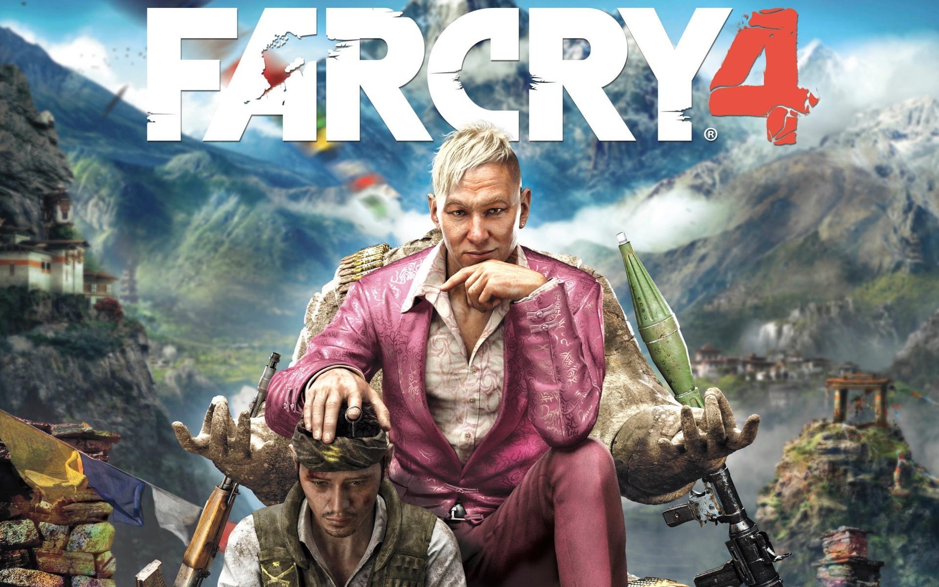 The hero of the game Farcry 4 in a pink suit, with a servant and a weapon on the background of a mountain landscape