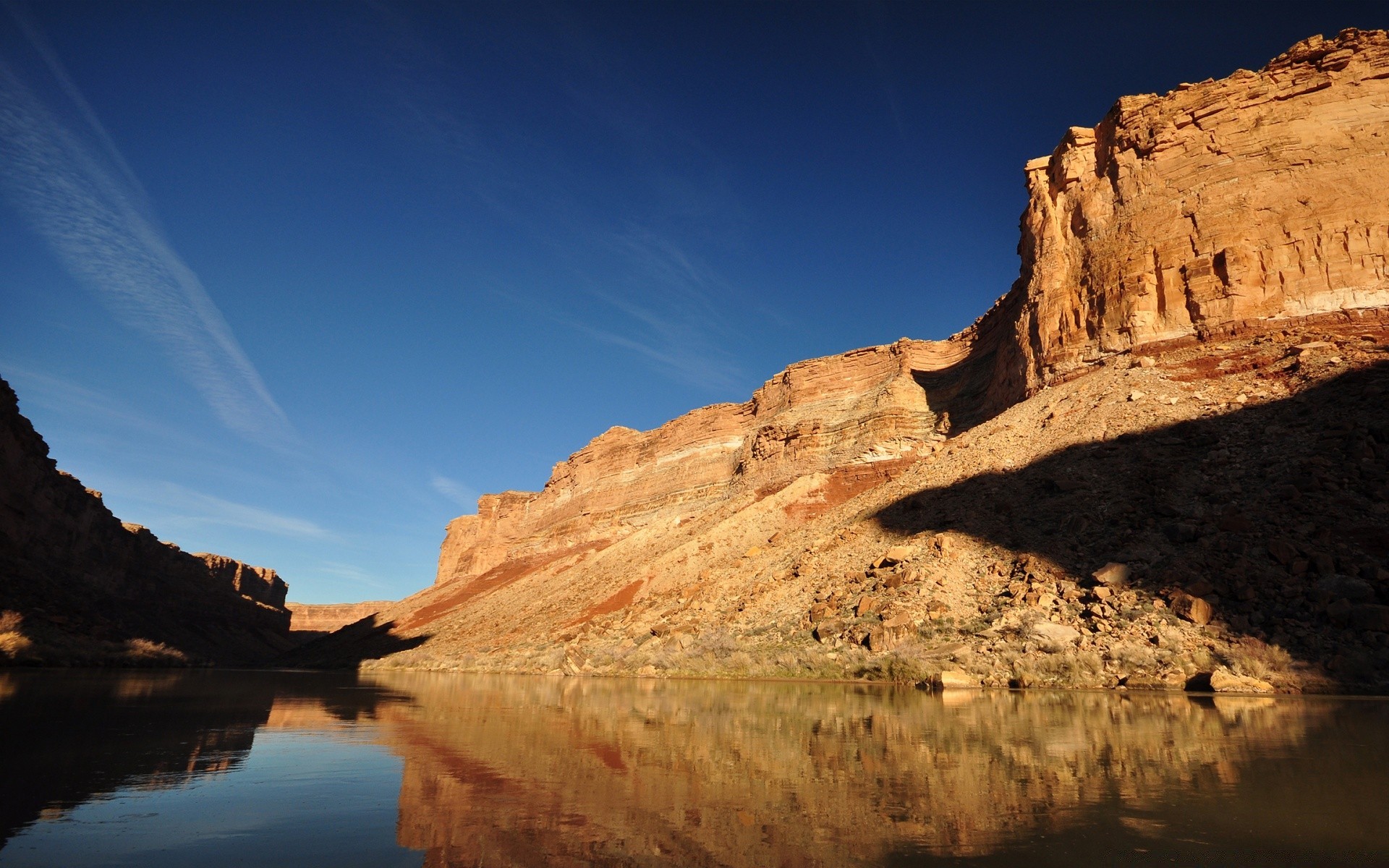 The rocky shore against the background of a clear sky is reflected in the waters of the river