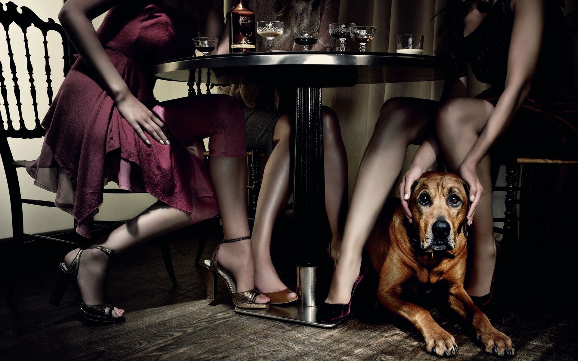 Blonde in a shiny dress with a deep neckline by a large armchair