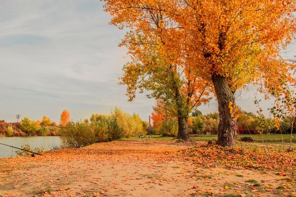 Fishing on the shore of the autumn tree