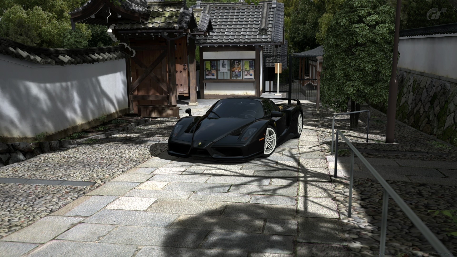 Black racing car on the sidewalk